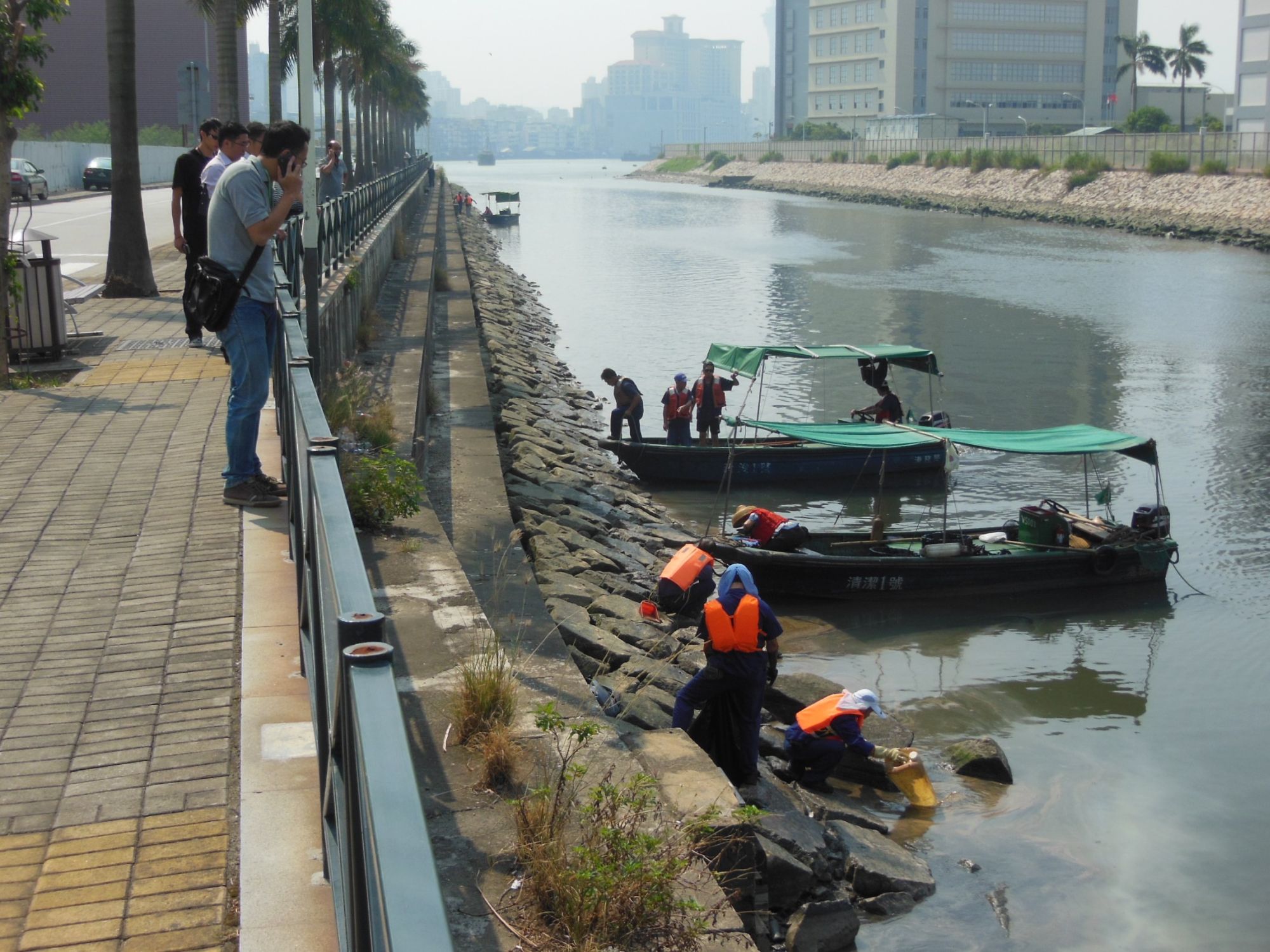 港務局人員不斷用工具收集現場油污,堵截了油污在河道擴散,但油污仍不時從渠口流出,至下午五時,港務局人員仍在現場繼續清理油污,預計清理工作仍需繼續進行。港務局人員和船隻亦會繼續在現場戒備,密切監察有關情況,防止油污擴散。此外,港務局人員於上周五(5日)在執行恆常的海岸巡查工作時,亦發現鴨涌河近跨工區位置有少量油污從渠口流出,並迅速完成了清理工作。