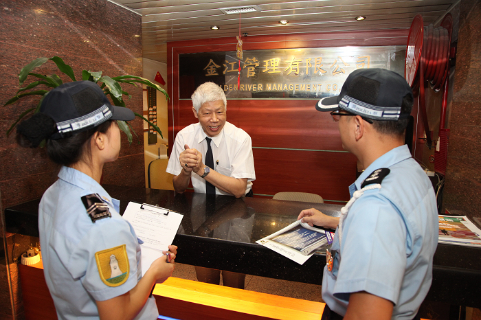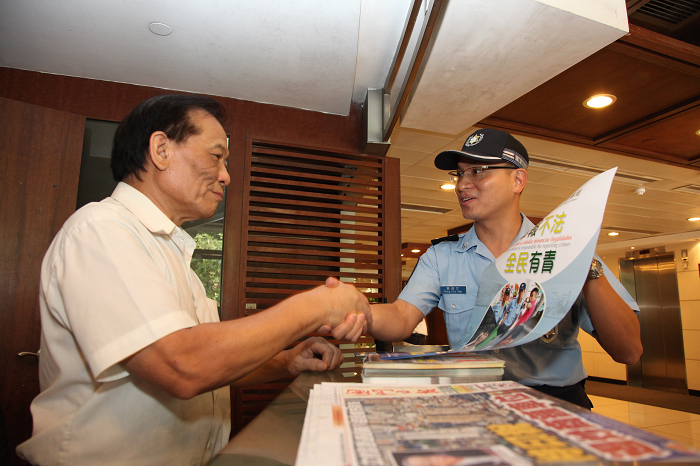 近年本澳商業活動愈見頻繁,商業樓宇亦較以往更有可能成為盜賊光顧的對象,本局對民居與商廈的安全同樣予以高度重視。今日上午,治安警察局公關處副警司黃超文率社區宣傳隊到新口岸一帶進行滅罪宣傳,目的在第四季加強包括商業大廈在內的管理員的防罪意識,做好相關預防工作。