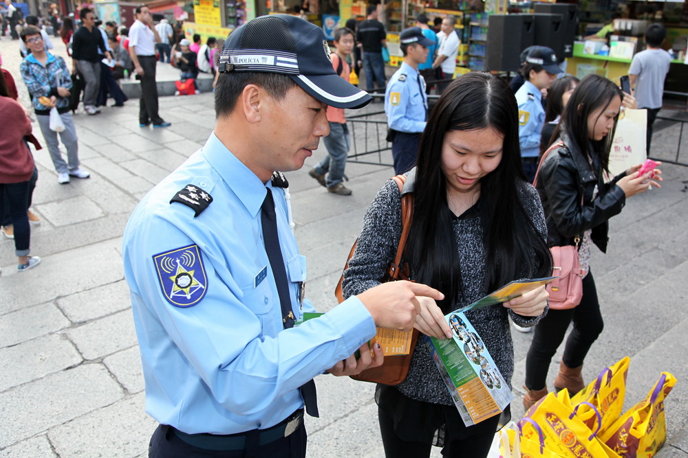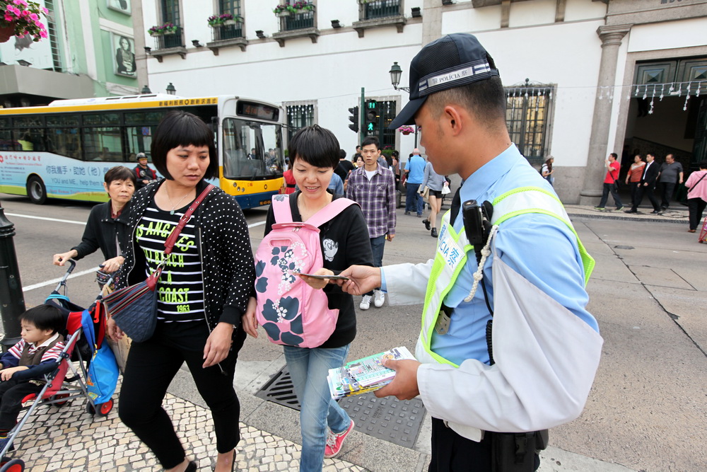 今天上午,本局公共關係處警司劉小俠連同澳門警務廳人員一行人到議事亭前地、板樟堂及大三巴牌坊一帶進行防扒及店鋪防盜宣傳活動。期間,宣傳隊向居民及遊客派發 “提防小手”小冊子,講解常見的犯罪手法,並即場對財物外露的人士作出溫馨提示,讓其了解正確保管財物的方法;亦向周邊商鋪進行防店鋪盜竊宣傳,提醒店員賊人的作案手法,特別在人多擠迫的時候提高警覺,以及適時提醒顧客注意個人財物安全。