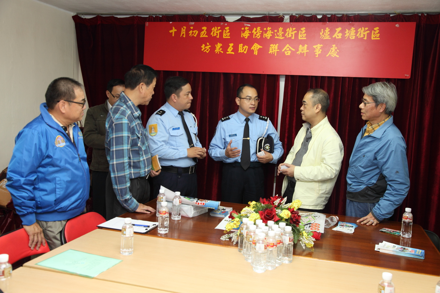 就三坊會代表提出的意見及個案,本局代表細心聆聽並即場作出回應或記錄跟進;會上亦向坊會派發 “大廈防罪”、 “店鋪防盜”、“提防小手”等宣傳品;雙方更合意聯辦宣傳活動,共促區內治安環境,讓市民安居樂業。治安警察局開展社區警務多年,有賴市民大力支持,我們會繼續防打並舉,以行動回饋社區。