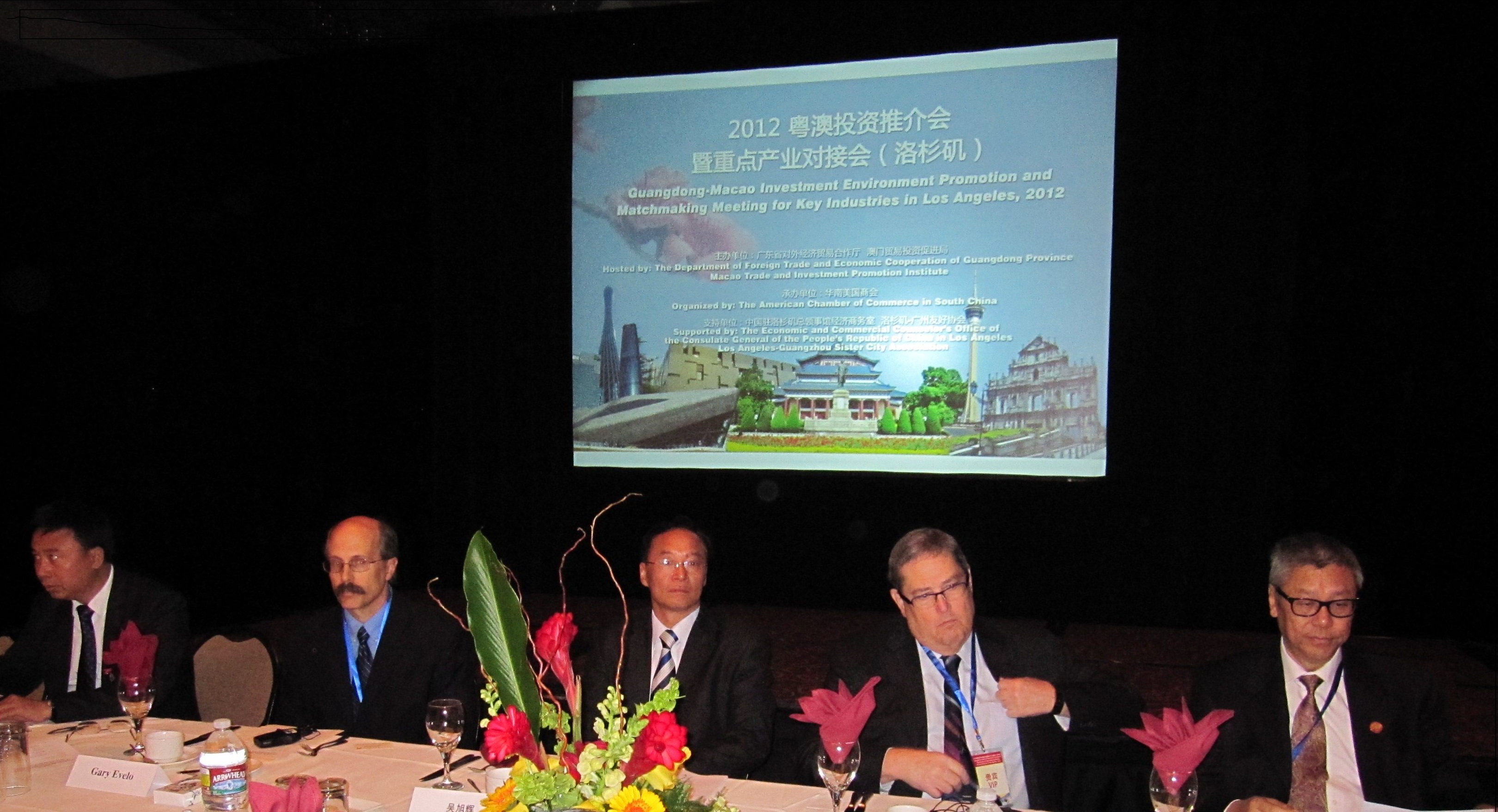 由澳門貿易投資促進局和廣東省對外貿易經濟合作廳共同主辦的“2012粵澳投資環境推介會暨重點產業對接會”, 分別於2012年12月11日在美國洛杉磯城市酒店及12月14日在加拿大多倫多喜來登酒店內舉行。