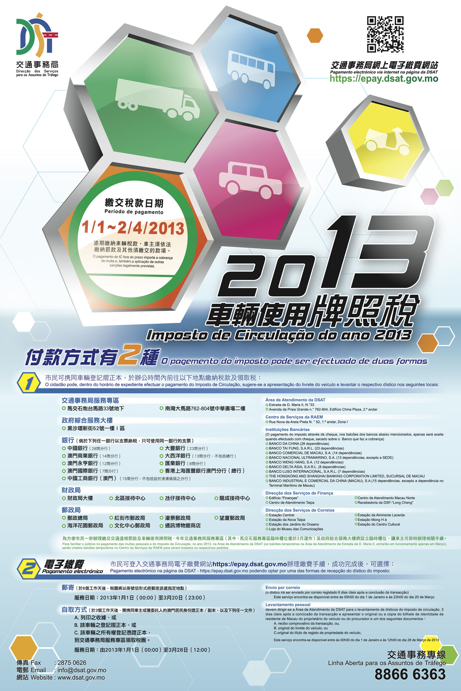 新一年度車輛使用牌照稅(即俗稱行車稅)徵收工作將於2013年1月1日展開,至4月2日結束。期間,交通事務局位於馬交石炮台馬路、中華廣場及政府綜合服務大樓的服務專區將增設臨時櫃位,讓車主可即時處理交通違例罰款及繳交行車稅,市民亦可登入交通事務局網上電子繳費網站https://epay.dsat.gov.mo辦理繳費手續。逾期繳納行車稅將被徵收過期罰款。