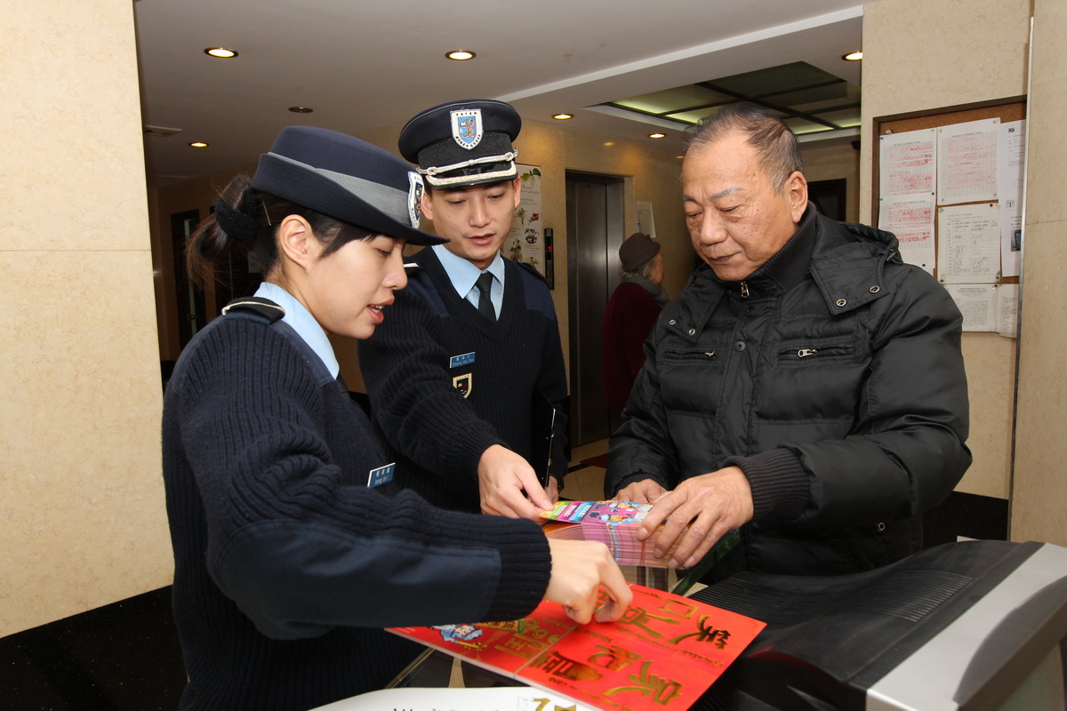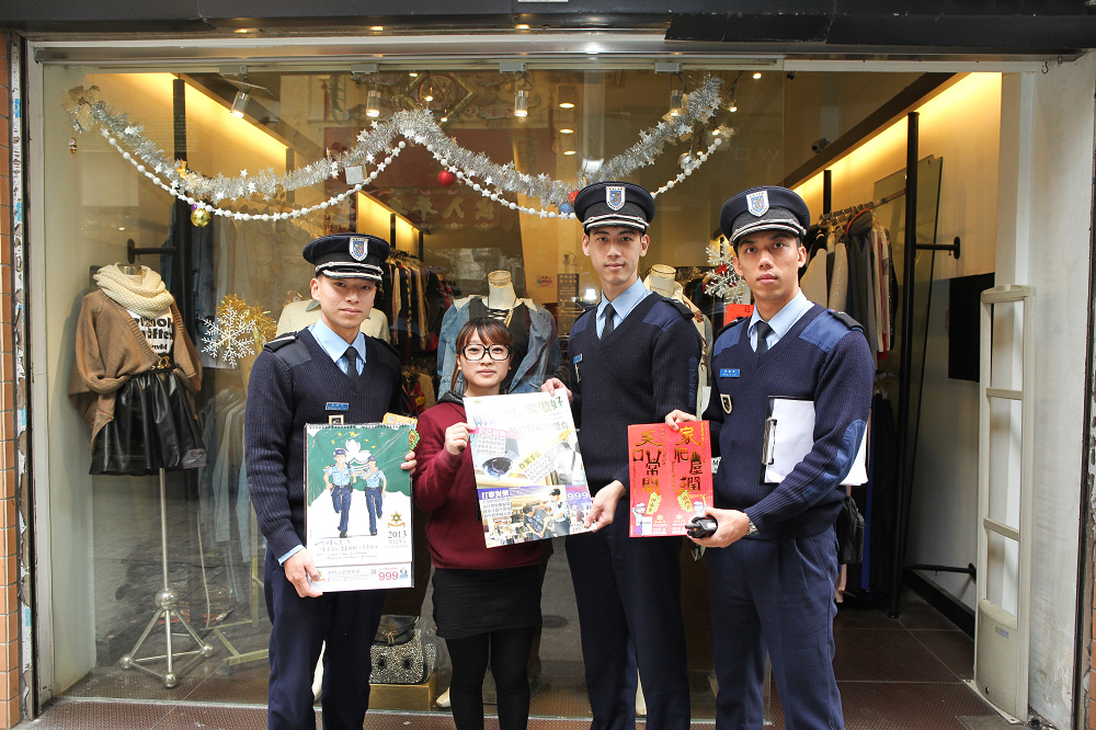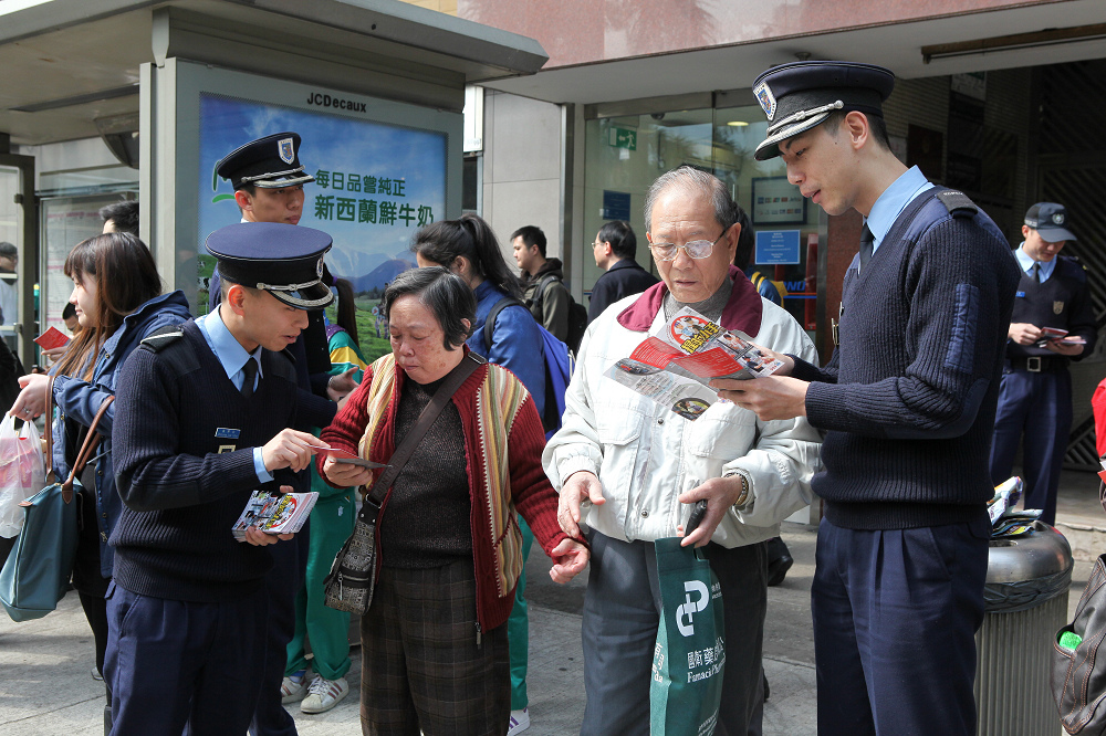 農曆新年即將到來,為配合各項相應的冬防治安工作,同時考慮到歲晚期間盜竊及騙案較為猖獗,而主因往往由於自身防範意識薄弱,故此,本局近期頻繁到本澳及離島警區加強大廈防罪、店鋪防盜騙等宣傳活動。而即將就職的準警官們學以致用,透過實地的參與發揮治安警察局服務市民的精神,連續兩天冒著寒冷到皇朝、南灣、殷皇子、關閘、黑沙環、水坑尾以及新橋義字街一帶,向不下百間的商鋪大廈、超市零售、餐廳食肆等派發新年掛曆,並沿途向市民旅客派發 “慎門戶 保安全”、 “提防小手”、 “慎防受騙”等主題的單張海報以及防罪 “揮春”。
