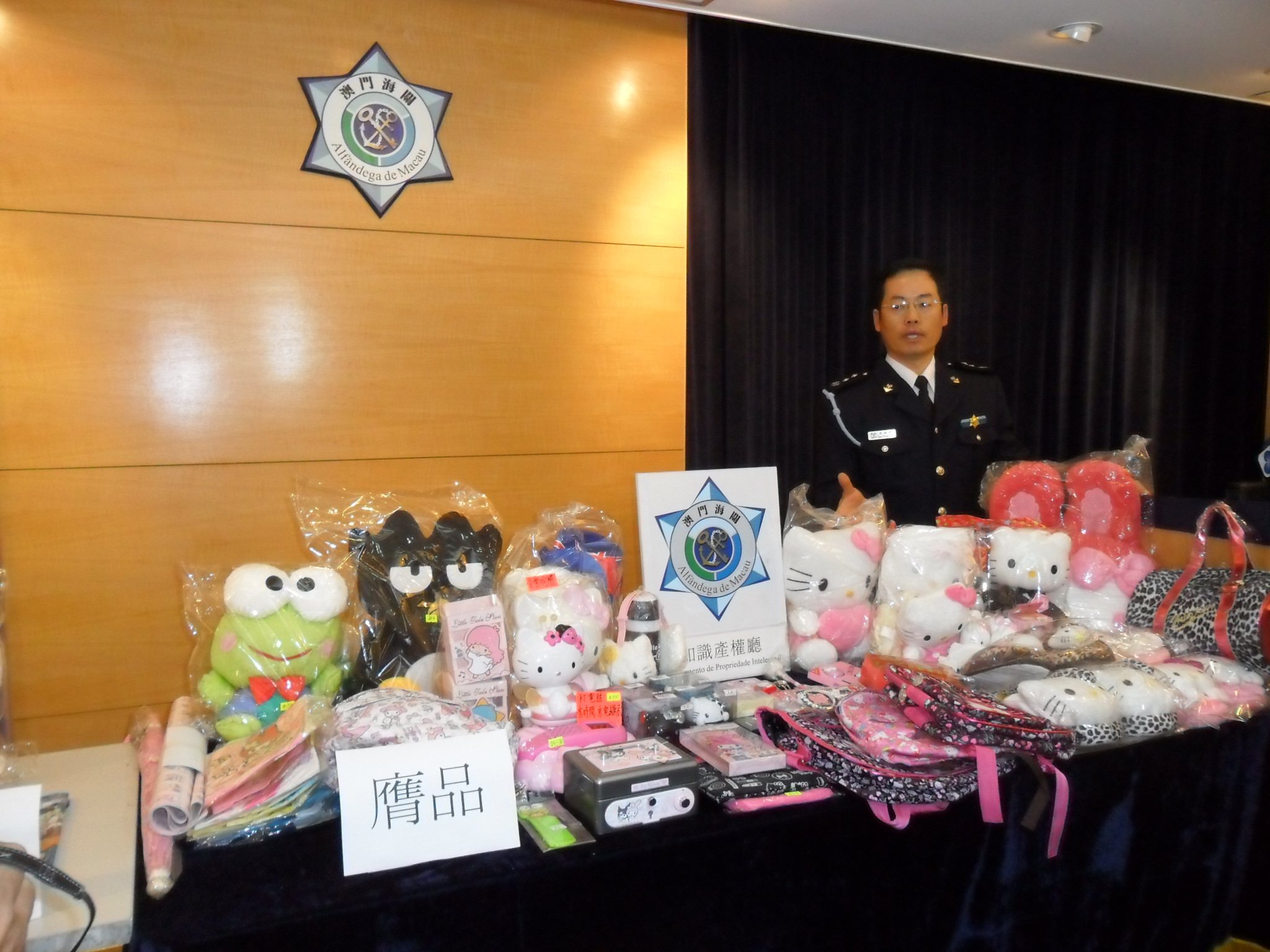 於本月二十四日,海關偵查人員對目標店舖採取稽查行動,行動中共緝獲偽冒物品二百零九件。包括「HELLO KITTY」、「MY MELODY」、「LITTLE TWINSTARS」、「POCHACCO」、「KEROKEROKEROPPI」、「BAD BADTZ-MARU」及「CINNAMOROLL」等多個卡通人物品牌,當中有室內電話、電話保護套、手錶、飾物、毛公仔及文具等等,物品估值約八千澳門元。