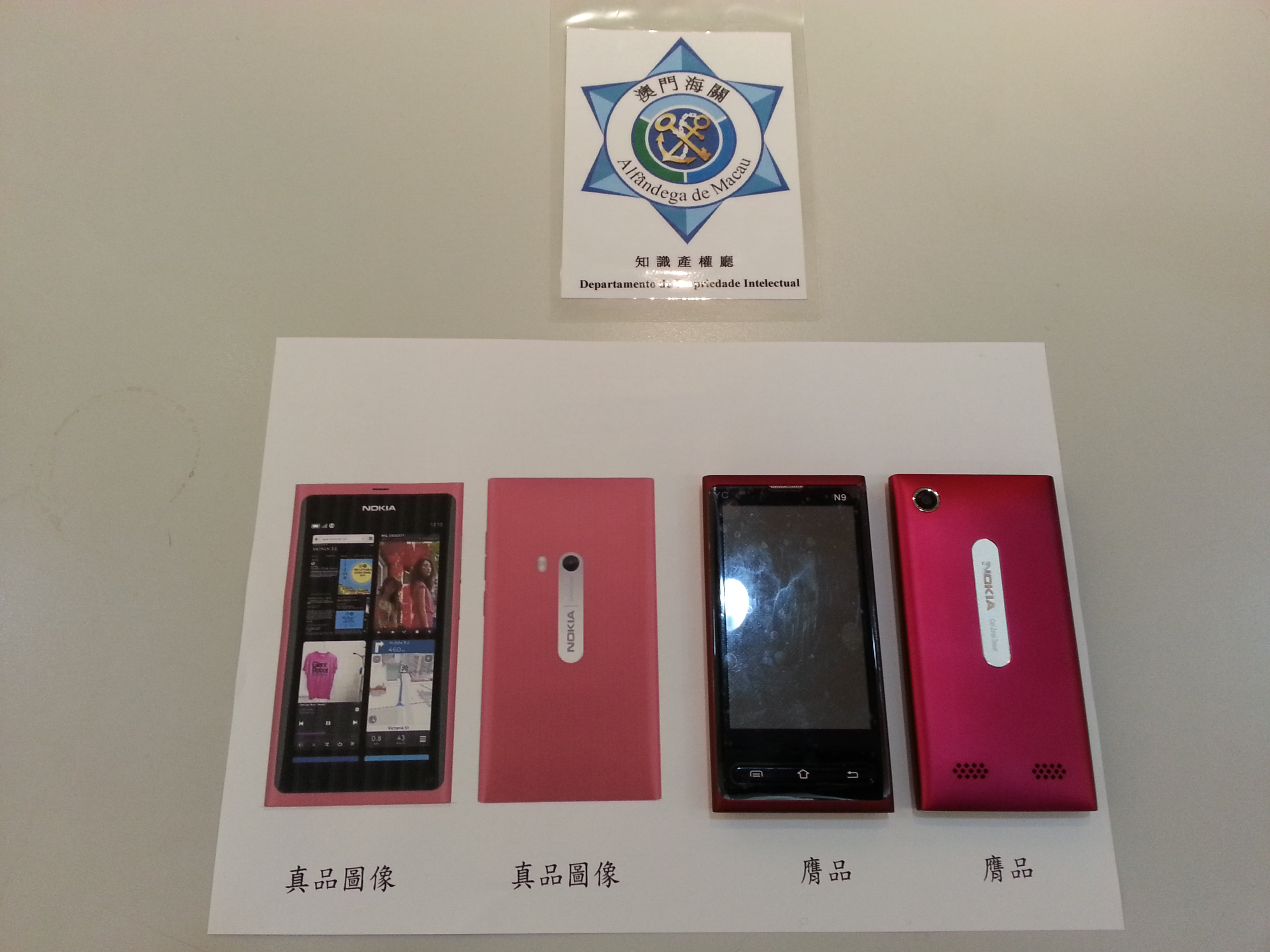 在一月二十七日傍晚,治安警察局澳門警務廳行動暨情報科探員巡經澳門提督馬路時,發現一男子不斷向途人兜售來歷不明的手提電話,故邀請其返警區協助調查,並隨即起動快速聯審機制,當晚即時轉交海關偵查人員繼續作進一步調查,在其身上搜出兩部 “NOKIA” N9型號手提電話及兩個手機充電器,經核實該品牌商標已在澳門特區政府經濟局作出合法註冊登記,在獲得有關品牌權利人代表的高度配合,連夜協助海關進行驗證工作,初步核實該等物證為假冒貨品。膺品與真品的大小、型狀和顏色在驟眼一看可能會騙到街上途人,但細心察看外觀和打開電話查閱內部功能時,便可知道假的真不了。
