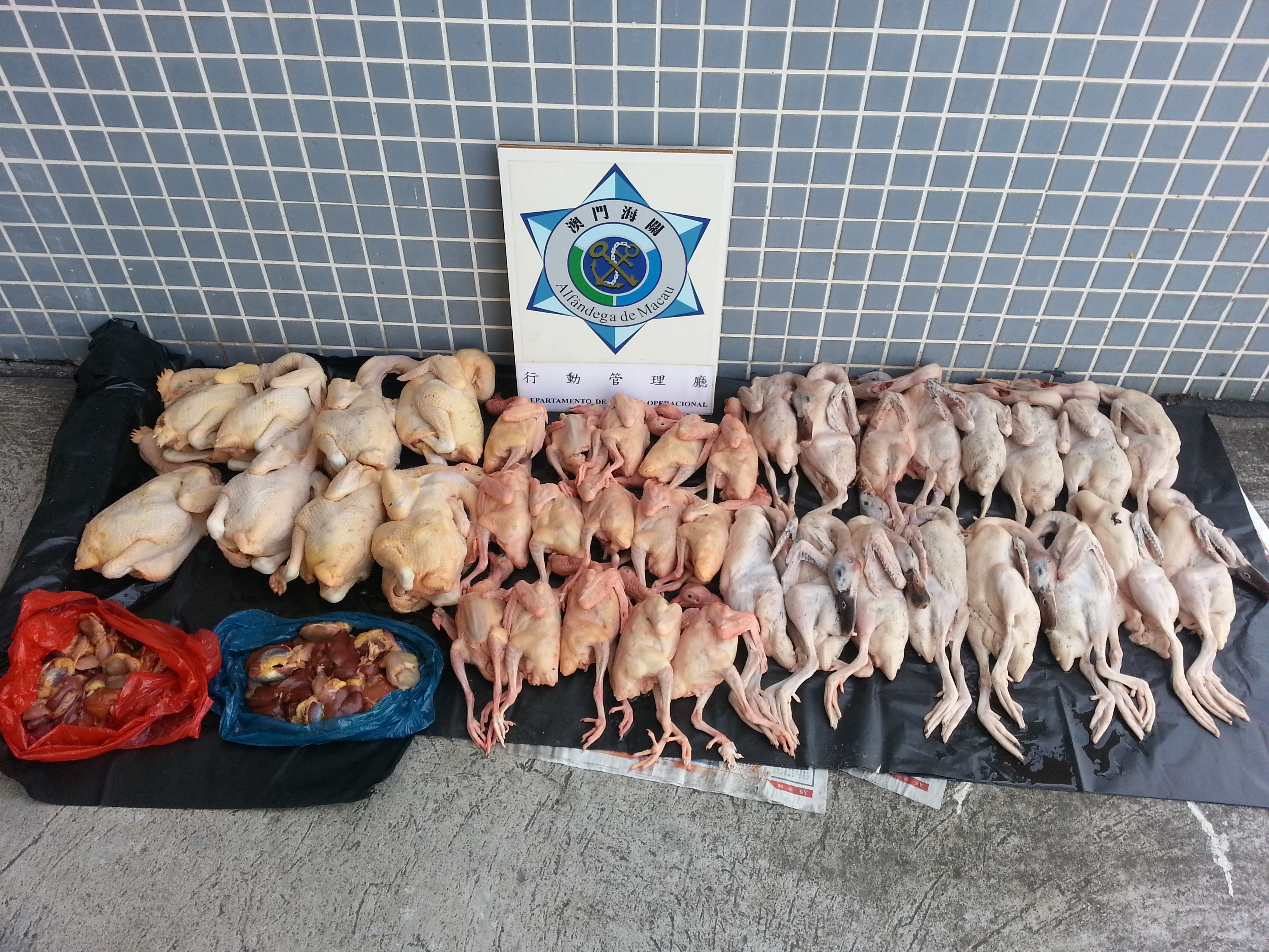 於今天早上7時,關員發現有水客將從內地帶回之物放置於台山如意閣附近,其後,一名男子到場整理有關物品,關員上前截查,檢獲一批未經檢疫已宰家禽。該名男子聲稱該批家禽是以澳門元100元帶工費透過一名水客帶回本澳,並準備運往新口岸售予「x記葡國餐廳」作食材之用。是次行動,經點算後,共緝獲已宰鮮雞及雞內臟共14公斤、水鴨8公斤及乳鴿3公斤。