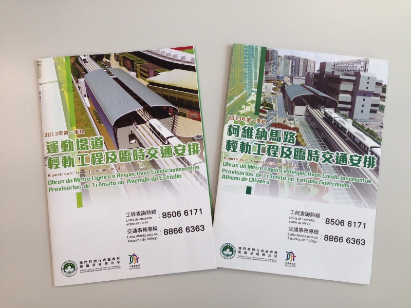 為配合運動場道及柯維納馬路的試圍封及臨時交通措施,運建辦與交通事務局已製作宣傳單張以供市民索取。市民倘對輕軌工程有任何查詢,也可親臨位於氹仔廣東大馬路179號悅景峰地下G室的「輕Zone-輕軌氹仔聯絡站」或致電工程查詢熱線8506 6171了解相關資訊。