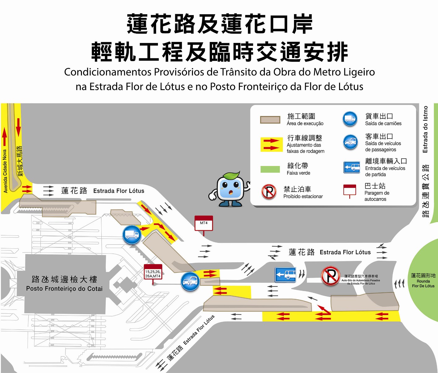 為進行輕軌系統蓮花口岸站及高架天橋樁基礎建設,運建辦已在農曆年前完成蓮花口岸內兩個施工區域的圍封,並將其餘四區的施工安排於農曆年後展開,避免對節假日期間蓮花口岸的通關構成壓力。隨著工程推進,該四區將於本月25日起陸續開展圍封及施工,位置包括現時設在路氹邊檢大樓內的上落客區、口岸閘口及司法警察局路氹分局對出之綠化帶。進行圍封期間,靠近司警大樓一段蓮花路會收窄至兩線,而進出境車輛檢查區的一段道路將調整至兩線行車。為減低影響及維持施工期間蓮花口岸的正常運作,運建辦由周三(20日)會率先進行一系列前期工作,包括建設臨時行人及行車通道,以協助建設期間分流蓮花口岸的車輛以及方便公眾安全地進出口岸。