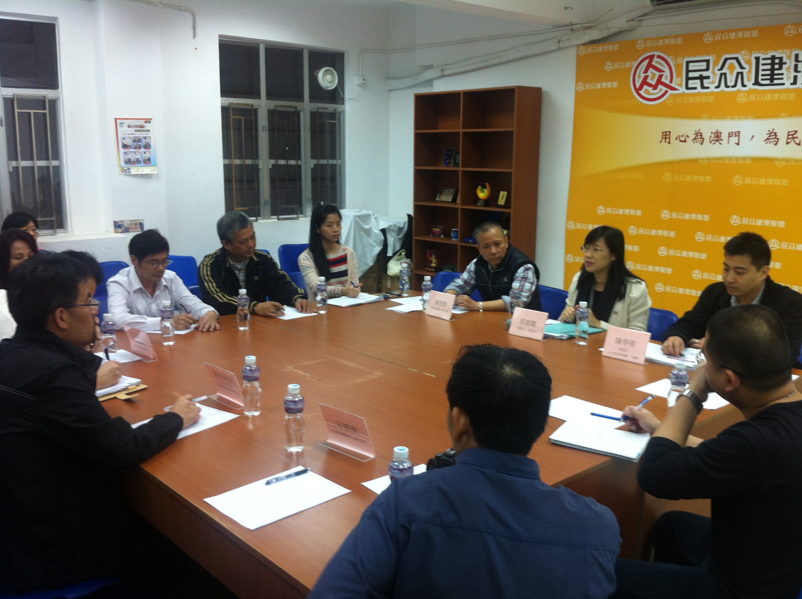 房屋局副局長郭惠嫻、公共房屋事務廳代廳長陳華強於3月25日向民眾建澳聯盟介紹即將於3月27日展開業興大廈1,544個一房一廳經屋單位之公開申請,該會副理事長陳德勝、宋碧琪等出席。