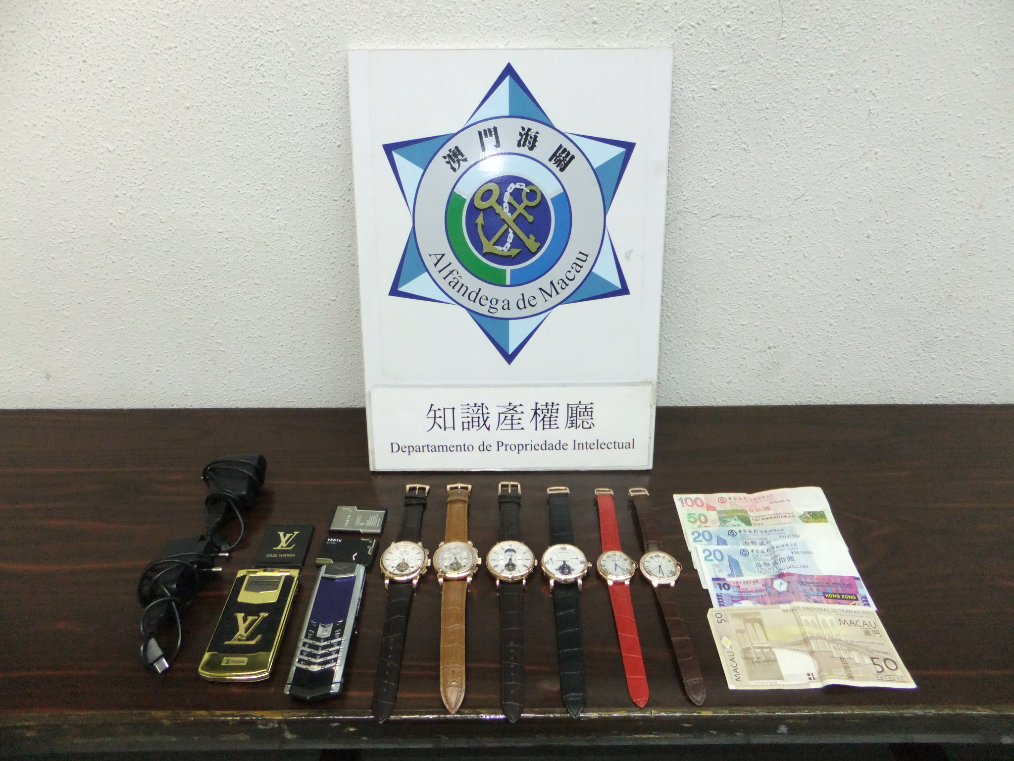 該名男嫌犯姓謝,年齡為三十九歲。搜獲之手錶為假冒「PATEK PHILIPPE」,「CARTIER」和「IWC」商標之品牌,而手提電話為假冒「LV」及「VERTU」商標之品牌。上述物品經核實,其品牌商標已在澳門特區政府經濟局作出合法註冊登記,經有關品牌權利人代表初步鑑定為假冒貨品。