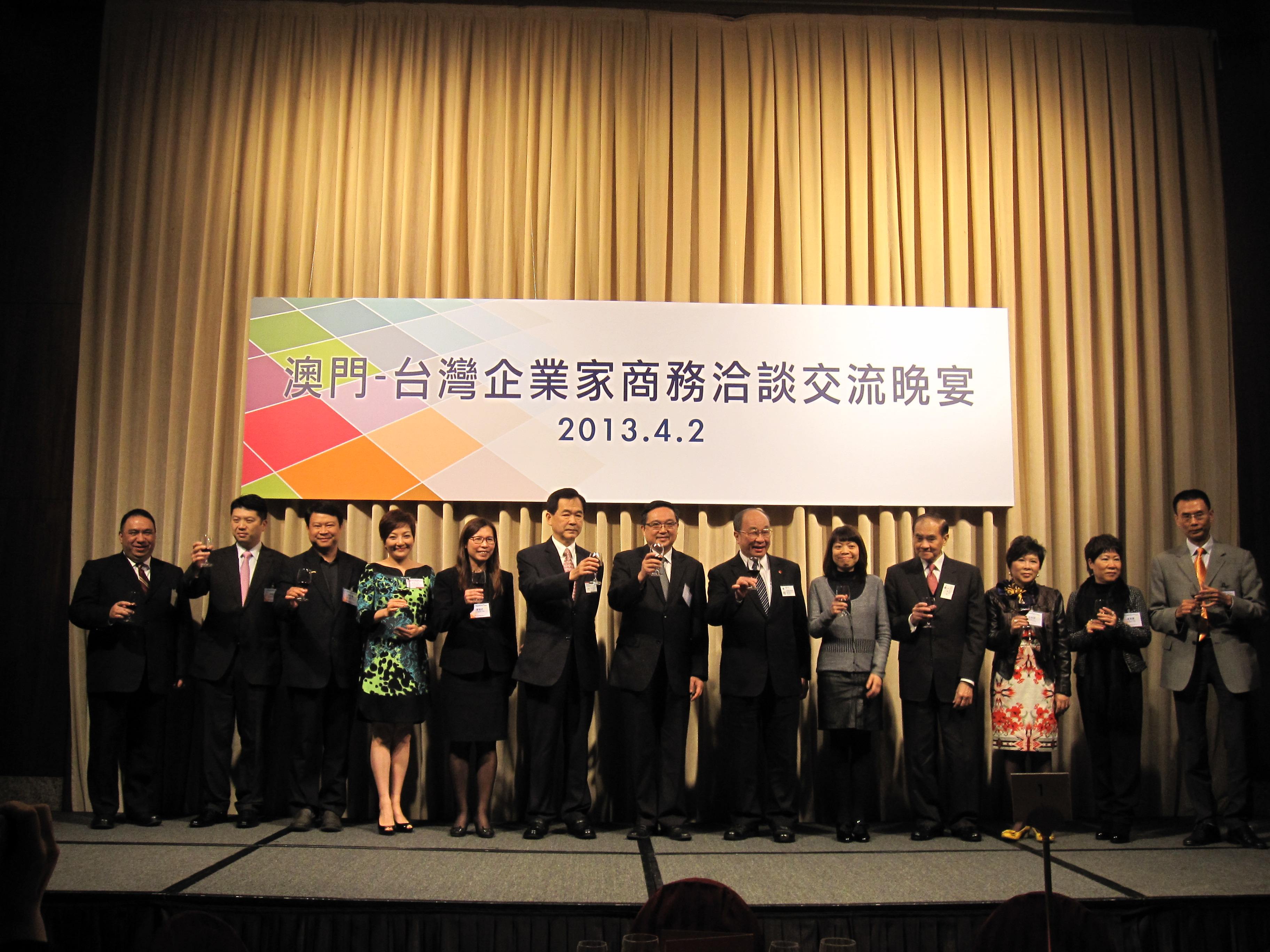 為進一步促進台澳企業交流,4月2日晚貿促局及台灣貿易中心共同主辦「澳門-台灣企業家商務洽談交流晚宴」,邀請了多個台灣品企業代表與代表團成員交流,共商合作契機。貿促局張祖榮主席致歡迎辭及陳敬紅執行委員向現場約150名本澳及台灣賓客介紹澳門投資環境及推介2013MFE。此外,台灣貿易中心趙永全秘書長向代表團致以最熱切的歡迎,並由該組織的市場研究處林瑋琦專員向與會嘉賓介紹了台灣最新經貿情況。澳門企業家代表團以及約69名連鎖行業機構及台灣品牌企業代表出席了晚宴,包括台灣商業總會王應傑監事會召集人、中華國際貿易協會陶鴻傑理事長、台北市廣告同業公會施惠瓊理事長、台灣連鎖加盟促進協會傅信欽副理事長及徐嬌蓮副理事長等。