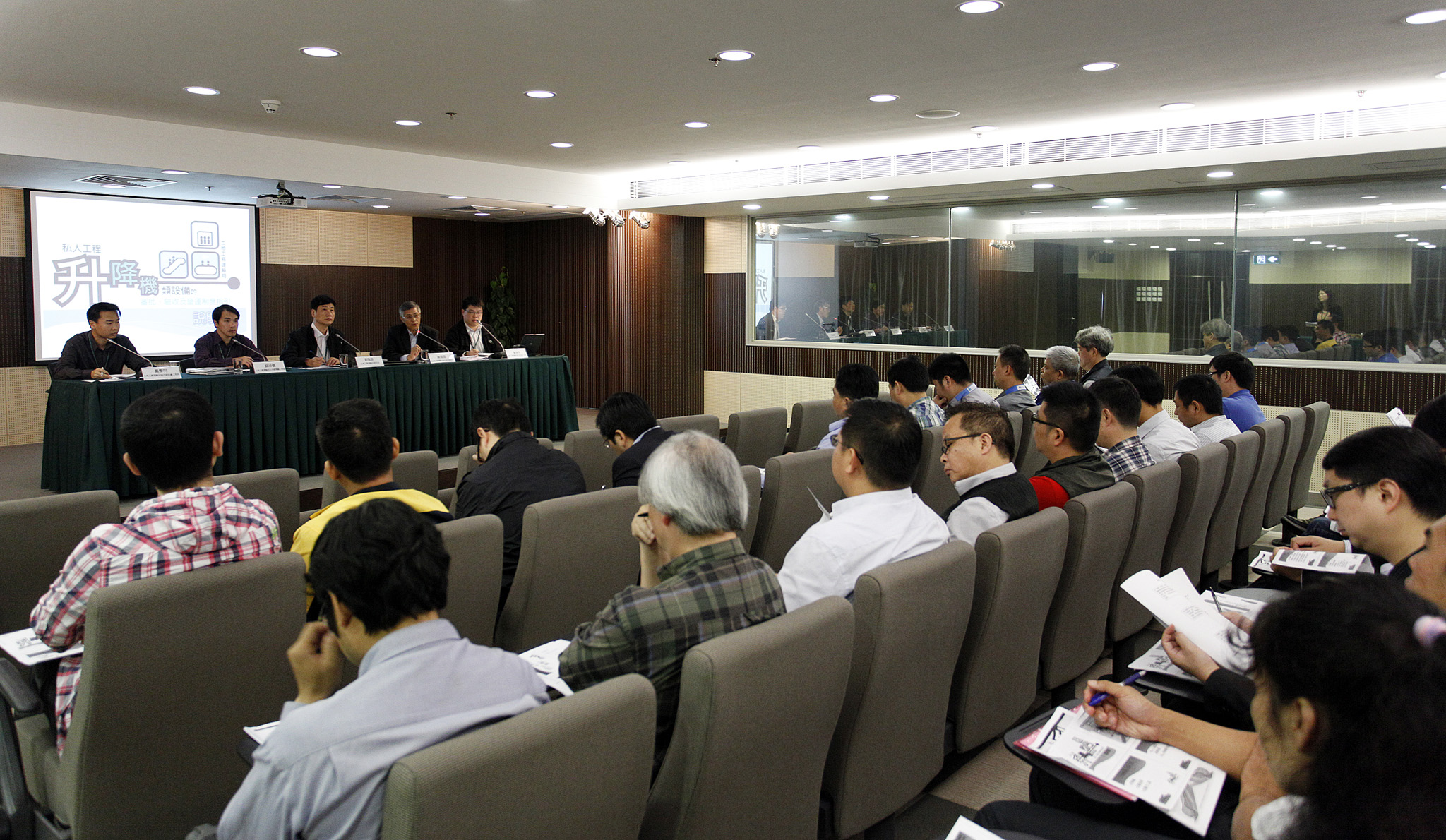 作為階段性成果,《私人工程升降機類設備審批、驗收及營運制度指引》(下稱“指引”)已於早前完成編撰及相關的行政工作。身兼跨部門工作小組成員的土地工務運輸局副局長劉振滄及城市建設廳廳長陳榮喜等於今天早上及下午,先後舉行業界講解會及記者會,介紹有關指引詳情,其中業界講解會有近百人出席。