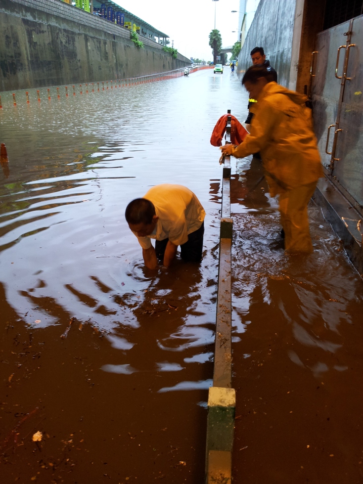 在降雨高峰時段,個別地段水深約兩尺,包括關閘行車隧道及內港等,民署人員協助臨時打開井蓋疏水,同時重置部份街道上鬆脫的渠蓋,確保安全。