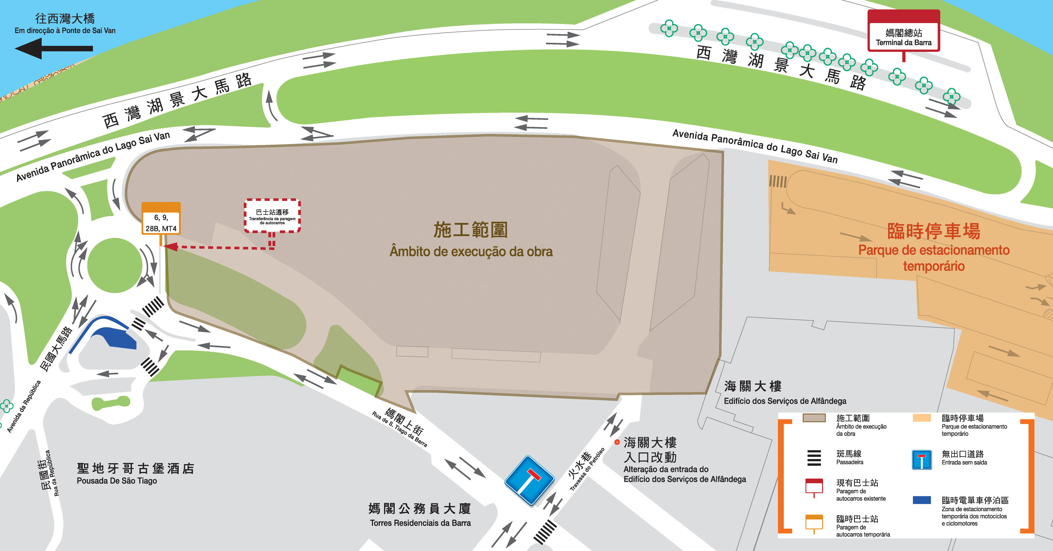 目前地下連續牆主體施工已陸續展開,配合施工需要,圍封範圍由周四(30日)上午10時起進一步拓展。其中,介乎媽閣海關大樓與聖地牙哥酒店圓形地之間的媽閣上街內路將進行圍封,除設於該路段的電單車位和輕型車輛泊位將暫停使用外,由於需要拓寬道路的關係,民國大馬路近聖地牙哥酒店圓形地的部份泊車位暫時停用,改為臨時電單車位;介乎於民國大馬路與火水巷之間的一段媽閣上街改為雙向行車,“媽閣上街”巴士站亦會向民國大馬路方向臨時遷移約60米,原停靠之6、9、28B及MT4路線則維持不變。