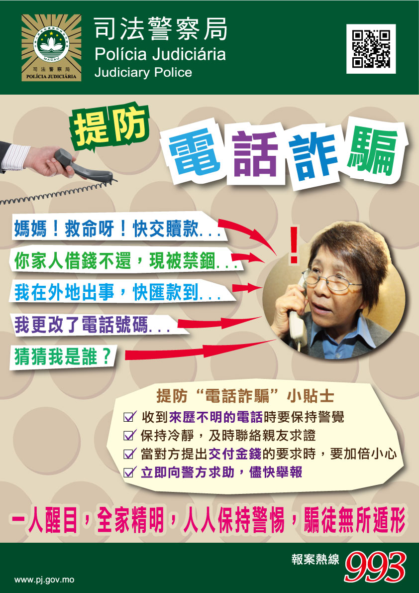 近期,本澳接連發生多宗電話詐騙案件,根據本局本年1月至5月份(截至5月28日)的資料顯示,涉及電話詐騙案51宗(立案23宗,舉報28宗),其中5月份已有23宗(立案10宗,舉報13宗),市民不幸被騙的案件有10宗,涉及金額共972,228元,被害人以長者為主(佔7成)。