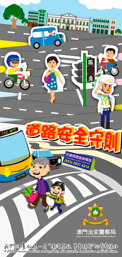 本局一向重視對交通安全的宣傳教育,並持續進行多種類型的宣傳活動,包括舉辦交通安全講座、擺放宣傳展板、分發宣傳單張及播放宣傳短片,提醒市民過馬路需要遵循的規則,包括在綠燈閃動時不應開始過馬路,如已開始過馬路則應加快腳步以避免交通意外等。同時本局亦製作道路安全守則的宣傳小冊子不僅列出各種交通違規的行為,還詳細講解交通安全的常識。