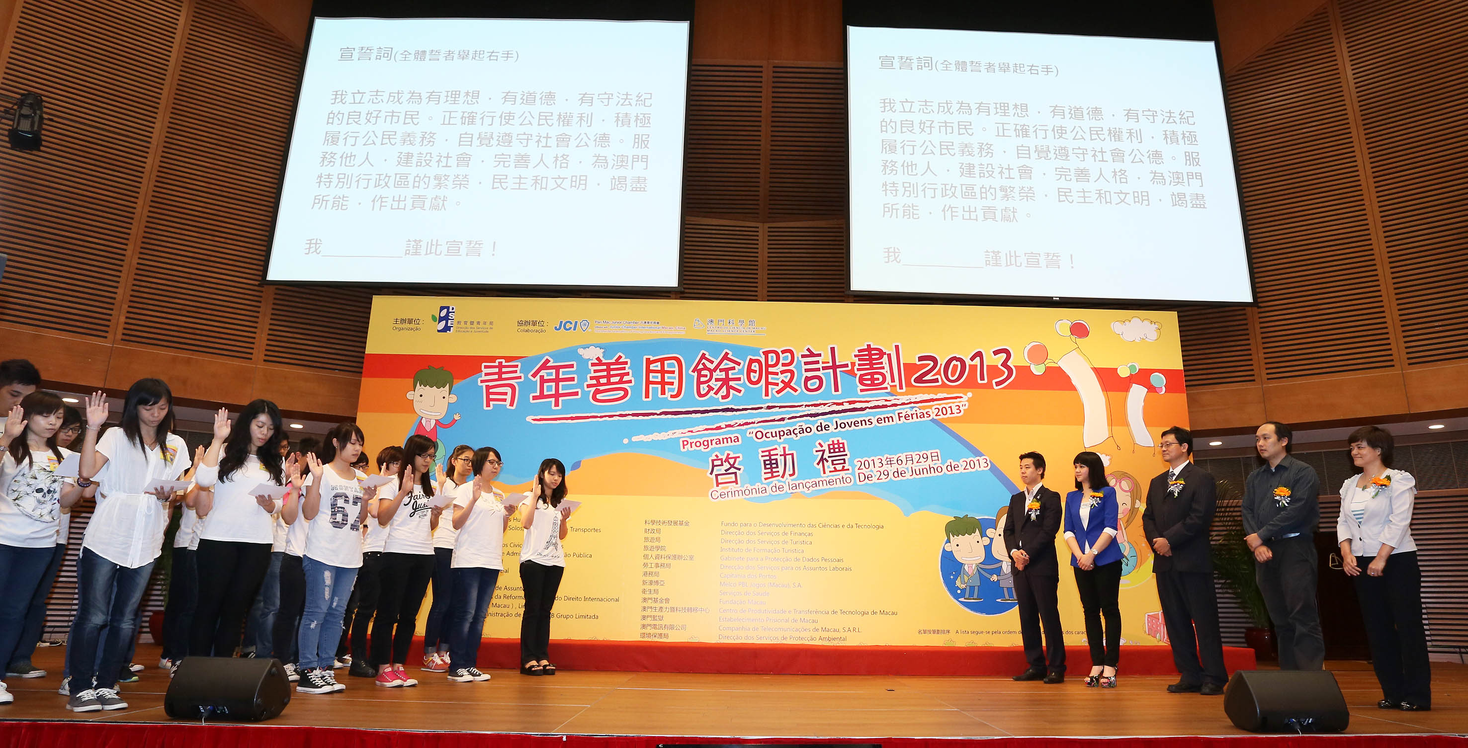 為配合及落實本年特區政府“鼓勵多元生活體驗,提升青年競爭潛能”的施政方針,同時加強青年生涯輔導工作,由教育暨青年局主辦、汎澳青年商會及澳門科學館股份有限公司協辦,並由本澳各公共部門和私營機構共同參與推行的“青年善用餘暇計劃二O一三”啟動禮於六月二十九日下午三時在澳門科學館會議中心順利舉行。