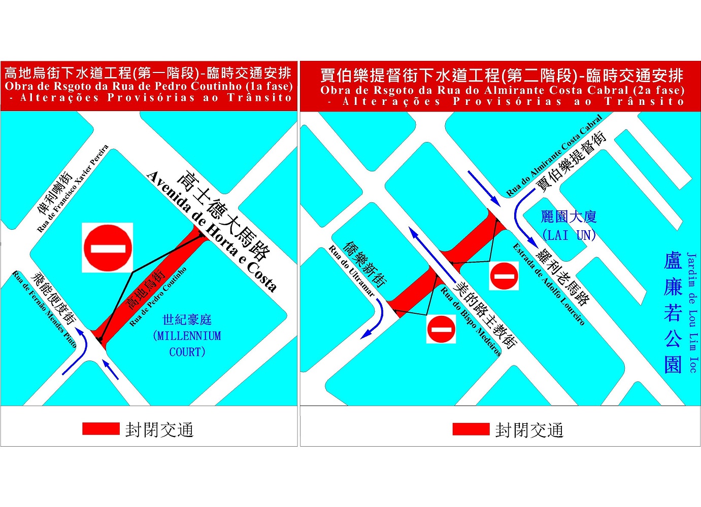 土地工務運輸局由周六(6日)上午10時起,分階段在高地烏街及賈伯樂提督街展開下水道工程,工期約50日。期間,相關路段將實施臨時交通封閉措施,交通事務局呼籲駕駛者留意。