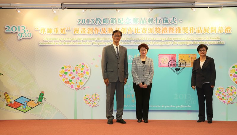 為慶祝九月十日教師節,弘揚尊師重道精神,向本澳教師致以崇高敬意,教育暨青年局再次與郵政局合作於本年九月十日發行二O一三教師節紀念郵品,並於同日上午十時在教青局仲尼堂舉行二O一三教師節紀念郵品發行儀式。這次紀念郵品以本澳的中、小、幼學校,以及特區政府自二OO一年設立教育功績勳章以來的獲得者為題材,以向一直在本澳教育事業貢獻力量的人士、學校和實體致以崇高的敬意。同場還舉辦了"尊師重道"漫畫創作及動畫創作比賽頒獎禮,以及在教青局轄下教育資源中心舉辦該比賽獲獎作品展覽。