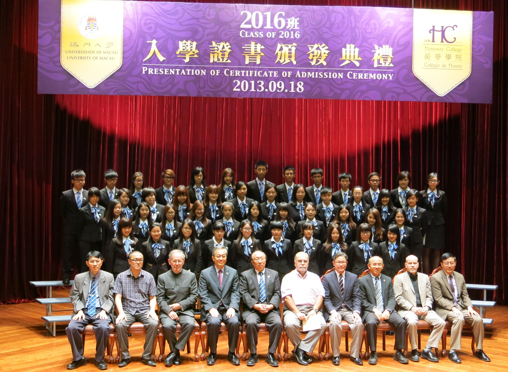 榮譽學院新生入學典禮在澳大校長趙偉教授、副校長何順文教授、馬許願教授、程海東教授及榮譽學院院長莫啟明教授見證下獲頒入學證書。是屆四十七名榮譽學院新生來自澳大六個學院、共十六個專業,在一百三十多名侯選人中,擇優錄取具領導潛能、學術成績優異的學生入讀。未來三年學生將有機會修讀個人潛能探索、領導力的發展、領導的國際觀等課程,並有到國外一流大學學習一學期的機會,提昇國際經驗和知識。學生亦能透過各研究項目,與專家、領袖會面交流,親身參與社區服務,學習成為國際精英及領袖人才的要素。