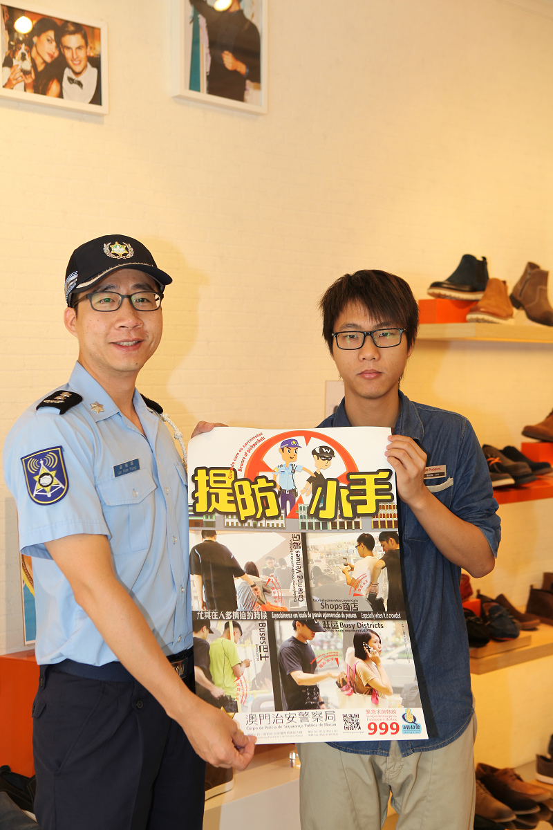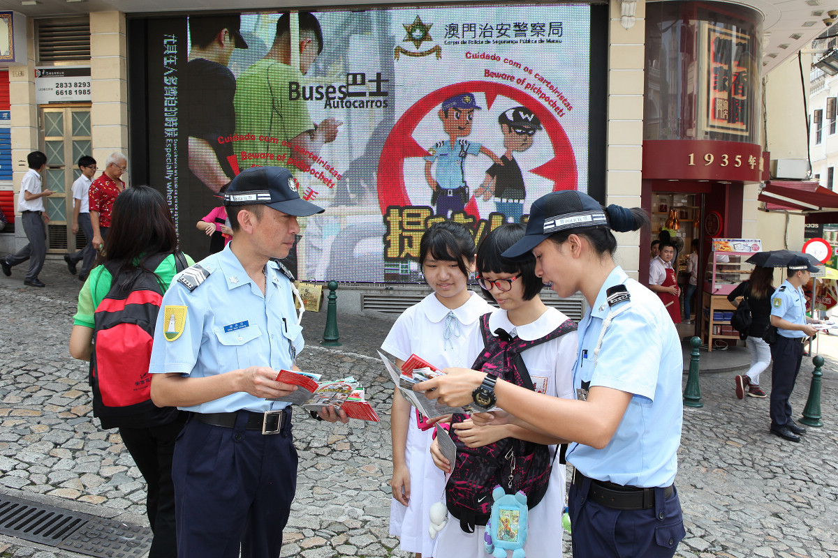 今天上午,本局公共關係處副警司源劍鋒、黃志宏連同第一警務警司處人員一行七人,到議事亭前地及大三巴一帶進行防扒及防店鋪盜竊宣傳活動。期間,宣傳隊向居民及遊客派發多款防罪小冊子,講解常見的扒竊手法,並即場對財物外露的人士作出溫馨提示,讓其了解正確保管財物的方法;同一時間,宣傳隊向周邊的商鋪進行防店鋪盜竊宣傳,講解店鋪防盜的注意事項及常見的盜竊手法,提醒店員在人多擠迫的時候要提高警覺,並適時提醒顧客注意個人財物安全,在有需要時應報警求助。