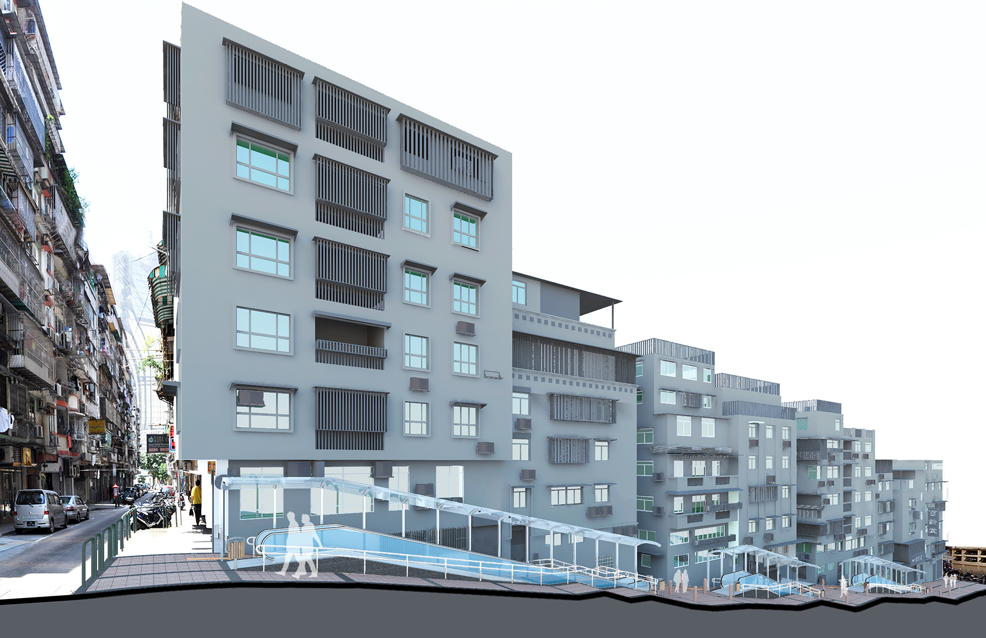 政府計劃在愕街中央設置單向上行的扶手電梯,由雀仔園街市前的公局市場巷,至東望洋新街,系統貫穿兩條橫路,包括高冠街及白灰街,為此,系統採用三段式設計,不會影響橫向行人道及行車道的使用,電梯兩邊各預留步行空間,市民離開扶梯後,可光顧兩邊商戶或返回住所,顯示設計上的人性化。愕街基本改為行人區,禁止車輛通行,只是與高冠街交界路口仍可予車輛穿過,以便救護車輛能夠進入。