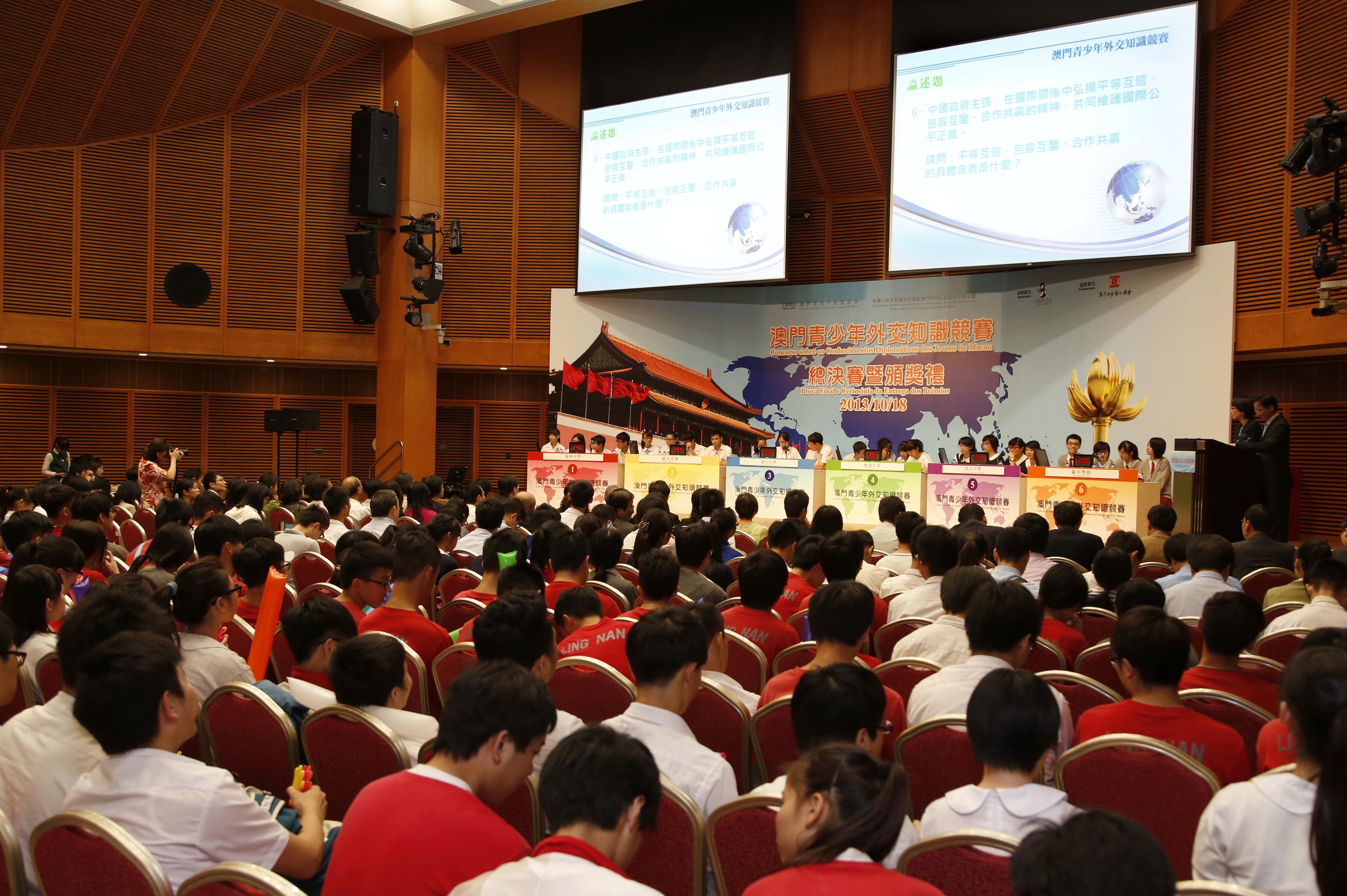 有關活動旨在提升本澳學生對外交知識和國際形勢的瞭解,拓展國際視野,提升青年競爭潛能。是次比賽共吸引本澳二十六間學校派出學生隊伍參加,參與隊數為歷屆之冠。初賽競爭非常激烈,六支隊伍成功晉身總決賽。為了讓賽制更為多元化,本屆總決賽新增了情景題,連同必答題、論述題、搶答題合共四個環節。本澳多所中學的校長及近四百名師生亦出席支持是次活動,為參賽同學打氣,現場氣氛熱烈。隨著在場觀眾此起彼落的吶喊助威,各參賽隊伍均越戰越勇。在搶答環節中,各比賽隊伍奮力搶分,分數爭持不下,於最後的情景題環節,令比賽進入白熱化階段。參賽學生精彩的表現獲得現場評審及觀眾的一致好評,令人印象深刻。