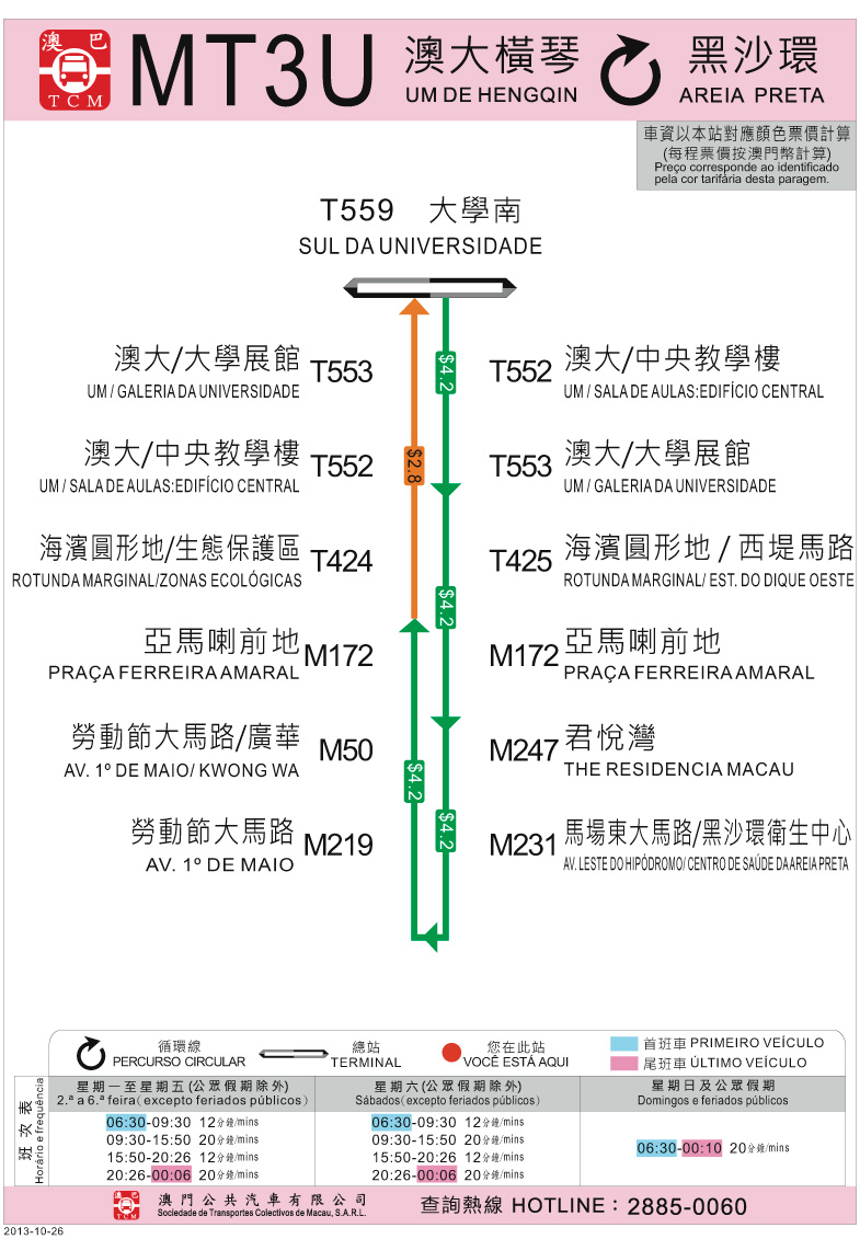 配合澳門大學橫琴校區逐步開放,交通事務局繼8月底啟運37U路線後,經參考澳門大學開展的師生出行習慣調查數據,因應不少該校師生的出行起訖點主要為北區和中區一帶,故局方將於本月26日(周六)起開通連接澳大橫琴校區至澳門中區和北區的快速巴士路線MT3U,以方便校內師生由橫琴校區往返澳門半島中區和北區,並利用轉乘服務前往本澳其他區份。因應澳大橫琴校區內的永久巴士總站仍未對外開放,故現階段該路線會以設於校區南側的“大學南"站作為臨時巴士總站,沿途並將經過橫琴澳大校園內的“澳大/中央教學樓"及“澳大/大學展館"站,再出“海濱圓形地/西堤馬路"站、“亞馬喇前地"站、“君悅灣"站、“馬場東大馬路/黑沙環衛生中心"站、“勞動節大馬路"站、“勞動節大馬路/廣華"站,然後經“亞馬喇前地"站、“海濱圓形地/生態保護區"站返回大學園區。