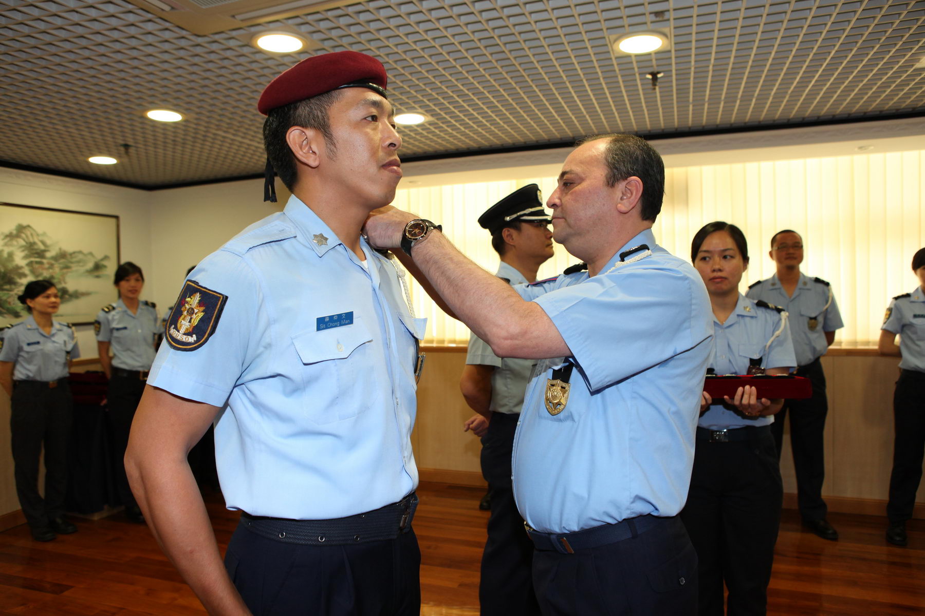 今天(十月二十五日)中午12時,在治安警察局總部貴賓室舉行了警長晉升儀式。儀式由治安警察局局長李小平警務總監及副局長黎錦權副警務總監及梅山明副警務總監主持。出席儀式的還有局內各部門的廳長及負責人,為同僚作出祝賀。晉升為普通職程警長共有13人 (男性11人,女姓2人)。