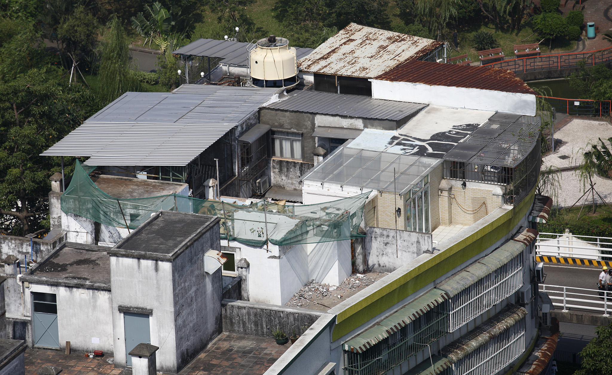 牧場街栢濤閣五樓B幢一共有六個單位,其中四個單位對上的天台分別建有由金屬、混凝土、磚牆等組成的僭建物,部份僭建物更有人屋住,違法人更將通往天台的梯屋改建,加裝閘門連接相應僭建物,霸佔公共空間。天台是發生火警時的疏散通道之一,長期被阻塞,置大廈各住戶於防火安全隱患之中;盡管有部份天台空間沒有被僭建,但已被僭建物包圍,通道被阻塞,渠道淤塞也無法進入清理,引致樓下單位長期出現滲漏。由於情況越趨嚴重,而且經初期的接觸,違法人並不合作。為此,土地工務運輸局今年將個案列為優先處理類别,並於上月刊登告示,要求各違法人盡快清拆,否則拆遷組會展開清拆行動,相關清拆費用由違法人承擔。