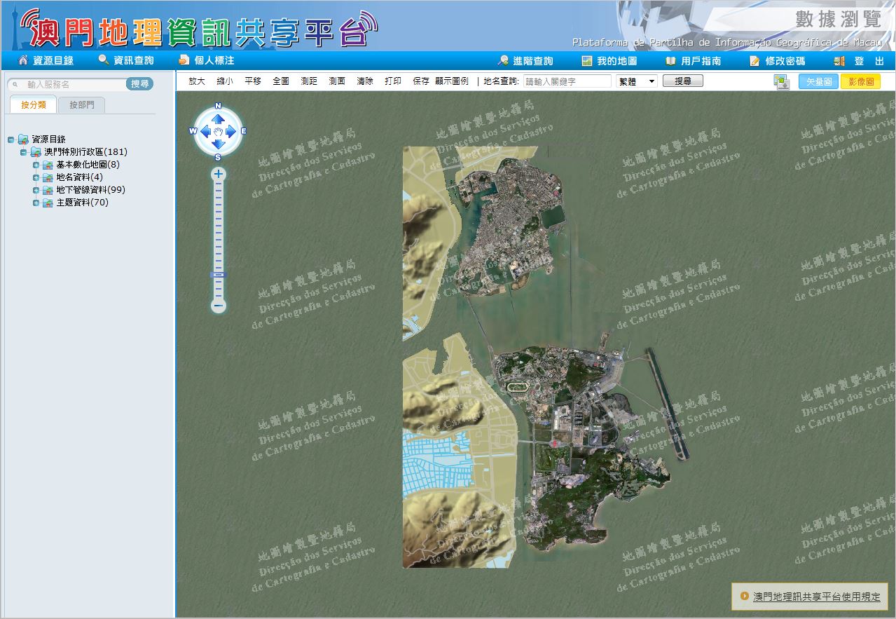 “澳門地理資訊共享平台”為政府空間數據的入口,平台現處於起步發展階段,重點希望將各部門的空間資源透過統一的平台與發佈機制,加強特區政府內地理資訊的網路化共享。