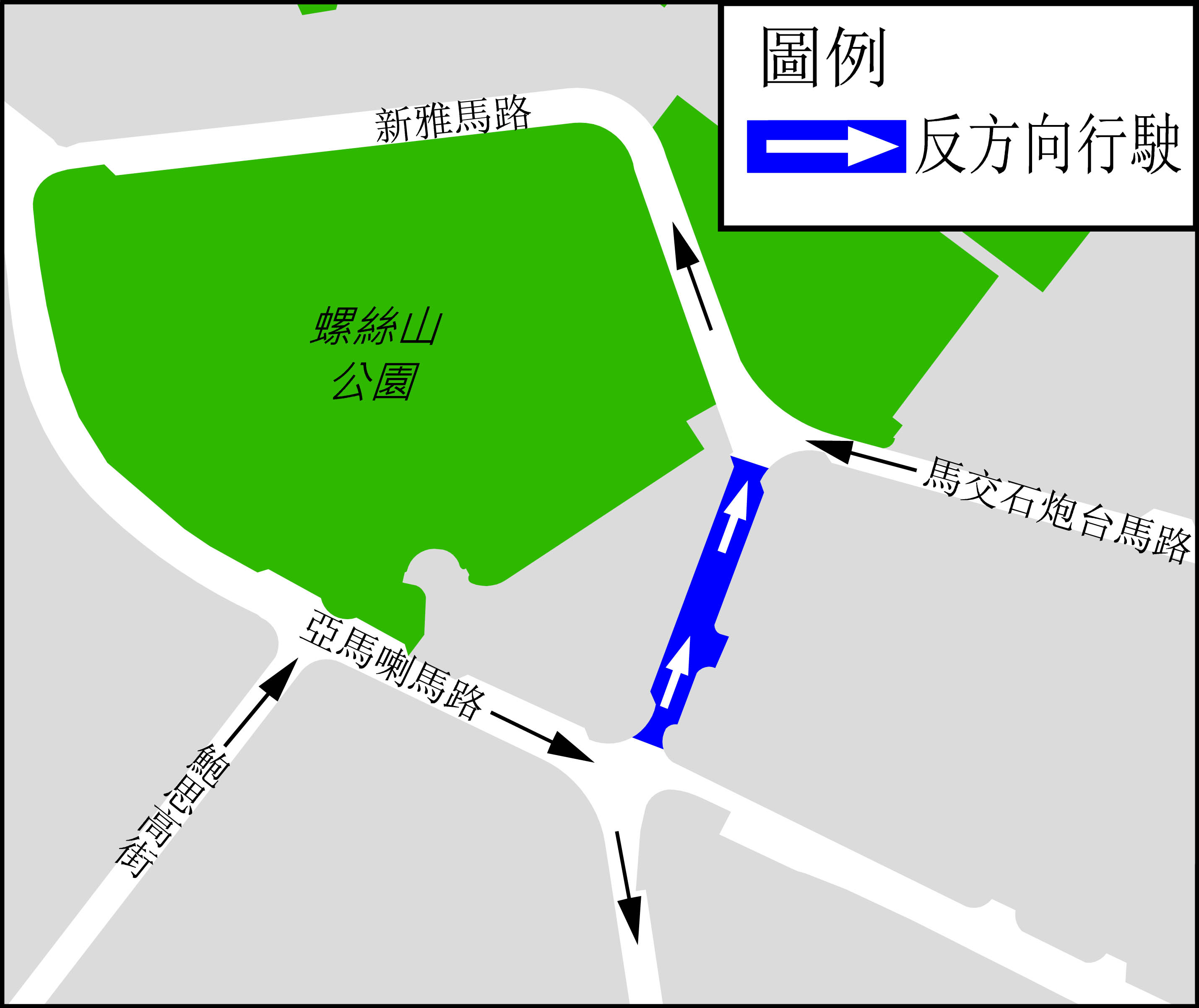 至於鄰近螺絲山的路段,包括介乎澳電大樓與母親會大廈之間的一段新雅馬路,則於賽事日每日上午6時至下午6時改作反方向行車,即車輛要由亞馬喇馬路往福海花園方向行駛,而來自馬交石砲台馬路(近澳電大樓)的車輛須繞行螺絲山公園後轉出亞馬喇馬路。
