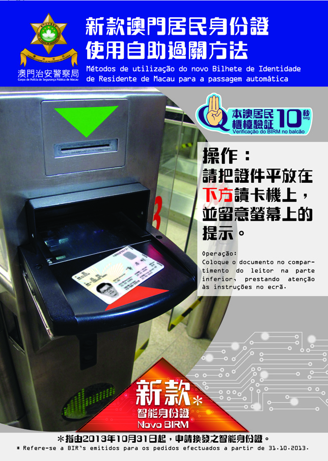 根據第22/2013號行政法規所核准的居民身份證新式樣,由2013年10月31日起,當局將發出「非接觸式」居民身份證(下稱“新證"),且不再發出「接觸式」身份證(下稱“舊證")。已領取“新證"且年滿11歲的澳門居民,當選擇使用自助過關系統出入境澳門時,須注意“舊證"與“新證"的操作有所不同。“舊證"依舊需插入系統上方的「讀卡槽」內,而“新證"則需平放於已在系統下方設置之「光學閱讀機」上,才可有效進行資料讀取。