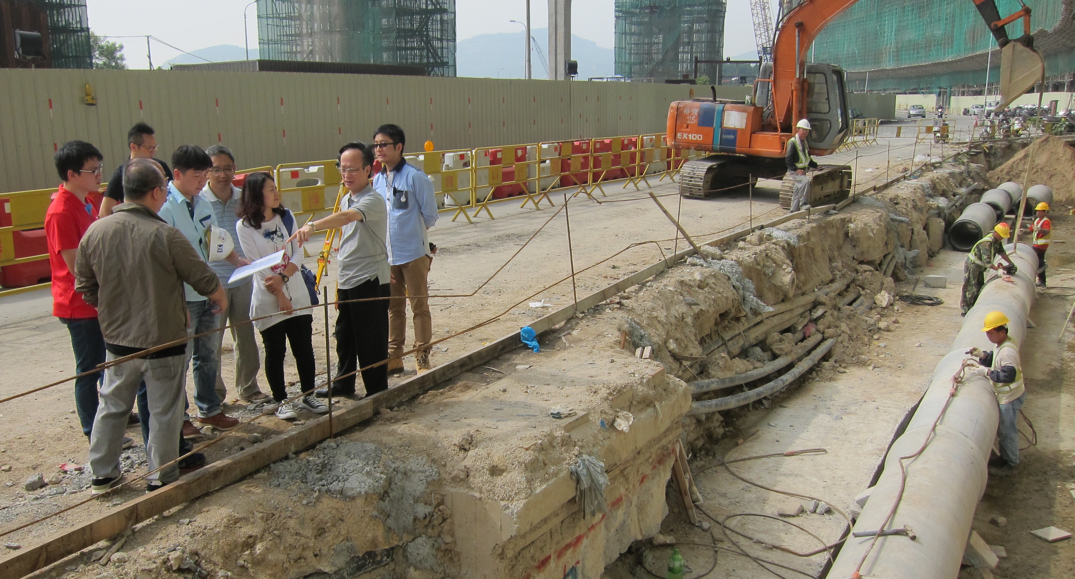 運輸基建辦公室聯同氹仔輕軌社區聯絡小組今(9日)早視察柯維納馬路一帶工程,並特別了解渠網建設狀況。隨著賽馬會一側的渠網即將完成,小組期望承建單位加快名門世家一側的工作,以儘早騰出空間推展交通樞紐的建設工作。