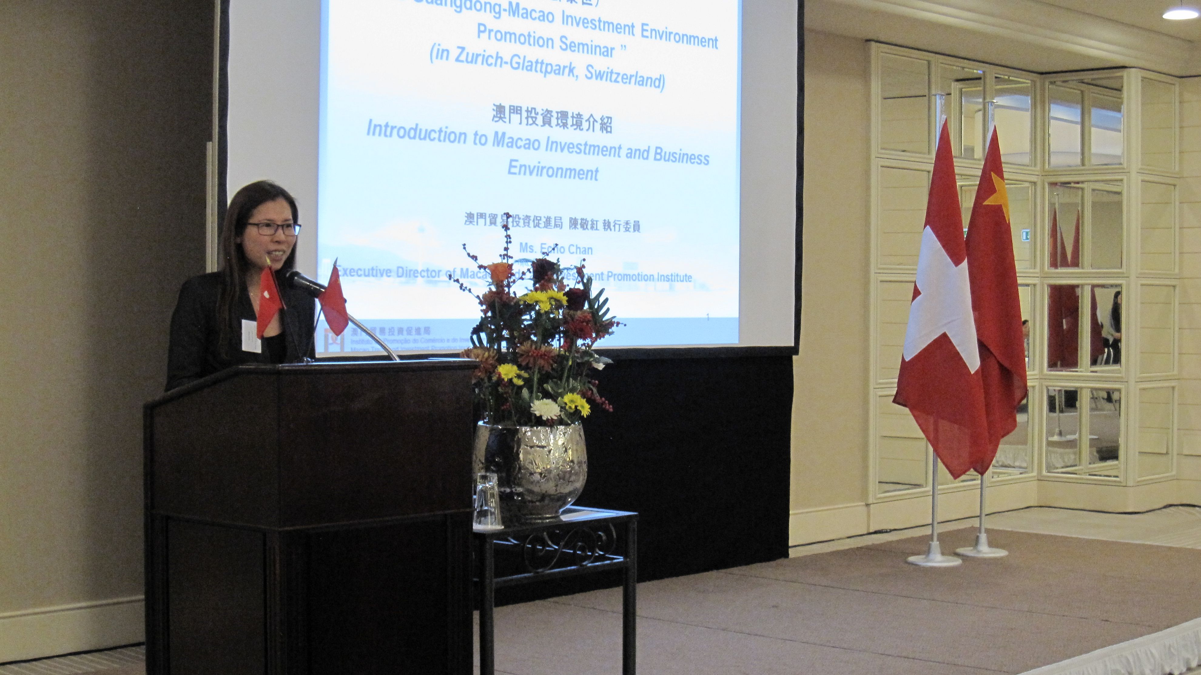 澳門貿易投資促進局執行委員陳敬紅在瑞士站推介會上發言指出,長期以來,澳門與瑞士一直保持緊密的經貿合作關係。2013年首3季兩地貿易額約6.1億美元,同比上升21%;澳門主要從瑞士進口產品包括鐘錶、珠寶、護膚品及藥品等。今年7月,中國與瑞士簽署了《中國–瑞士自由貿易協定》,瑞士是第一個與中國簽署自由貿易協定的歐洲國家;澳門與瑞士亦於2005年簽署雙邊航空協定,進一步推動了兩地在經貿、旅遊及航運等多方面的交流。
