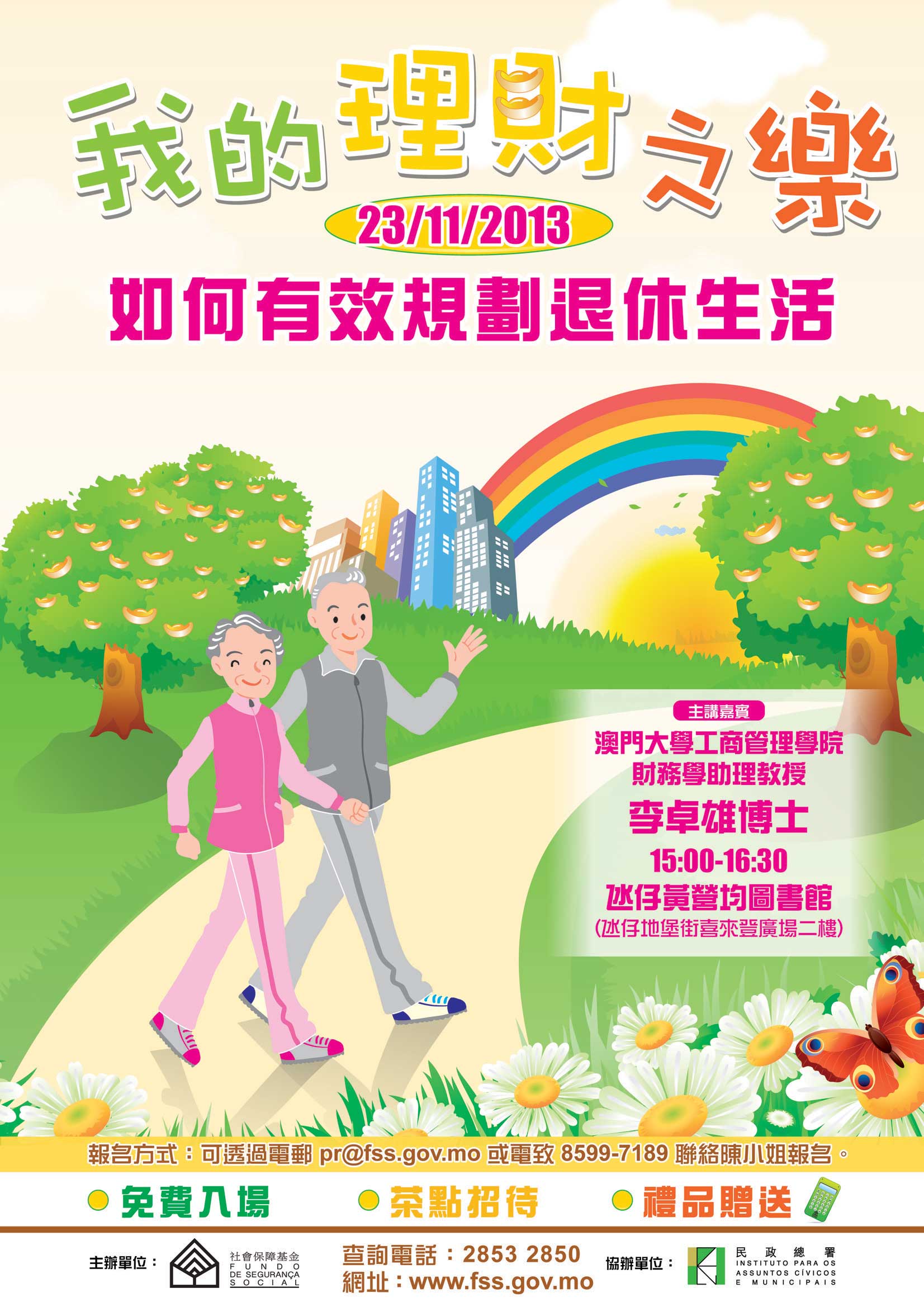 有興趣的人士可於辦公時間致電85997189報名,或郵寄姓名、出席人數和聯絡電話至pr@fss.gov.mo。活動名額有限,額滿即止,詳情可瀏覽社保基金網頁www.fss.gov.mo。