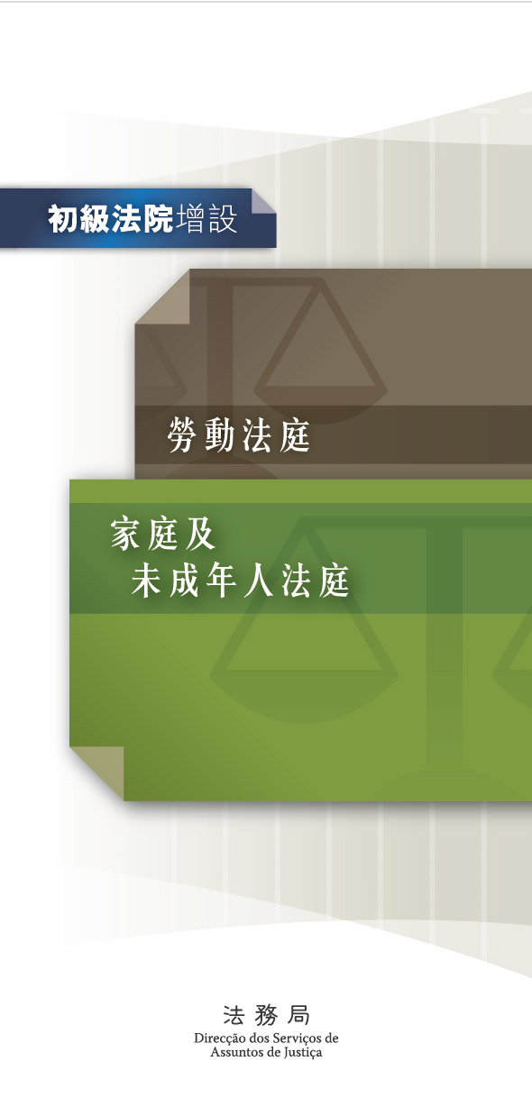 初級法院已於二零一三年十月十六日起設立“勞動法庭”和“家庭及未成年人法庭”。為幫助市民對新增設的兩個法庭有更進一步的認識,法務局特別印製了“初級法院增設勞動法庭和家庭及未成年人法庭”單張,主要介紹初級法院的組織、勞動法庭和家庭及未成年人法庭的管轄權等內容。