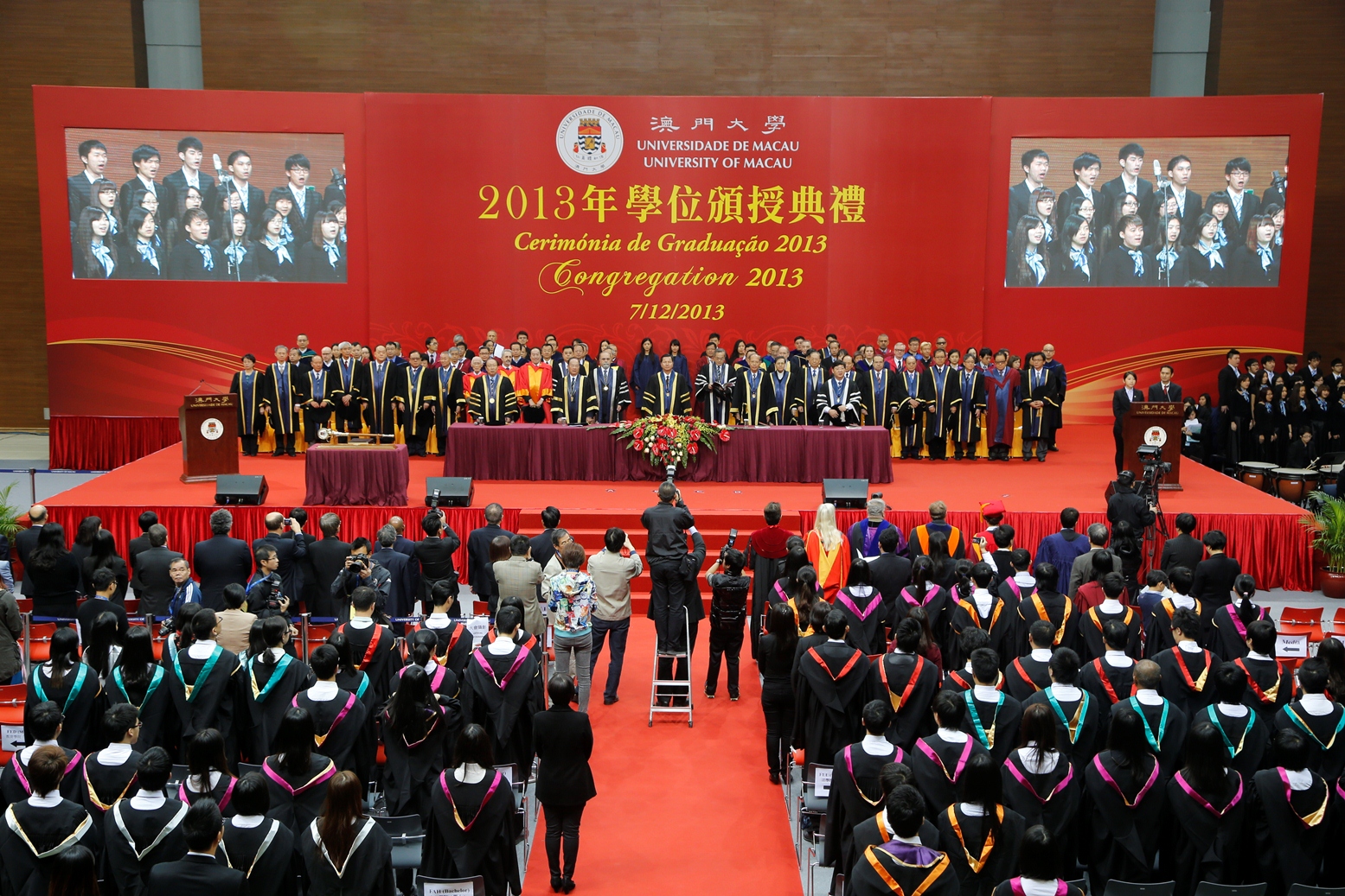 澳門大學(7日)舉行二○一三年學位頒授典禮,由澳門特別行政區行政長官兼澳大校監代表、社會文化司司長張裕主持。他表示,澳大藉著新校園的契機進一步完善大學的軟硬件設施,培養拔尖創新的專才和人才。