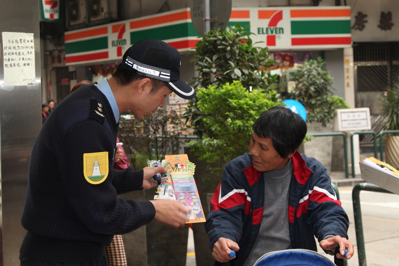 昨日上下午分別落區進行的宣傳活動,由本局公關處和澳門警務廳多位警官組織,獲提柯區坊會和新橋坊會的負責人黃祖添、尹根、羅寶泉和李志遠熱情接待,並派出義工協助宣傳。