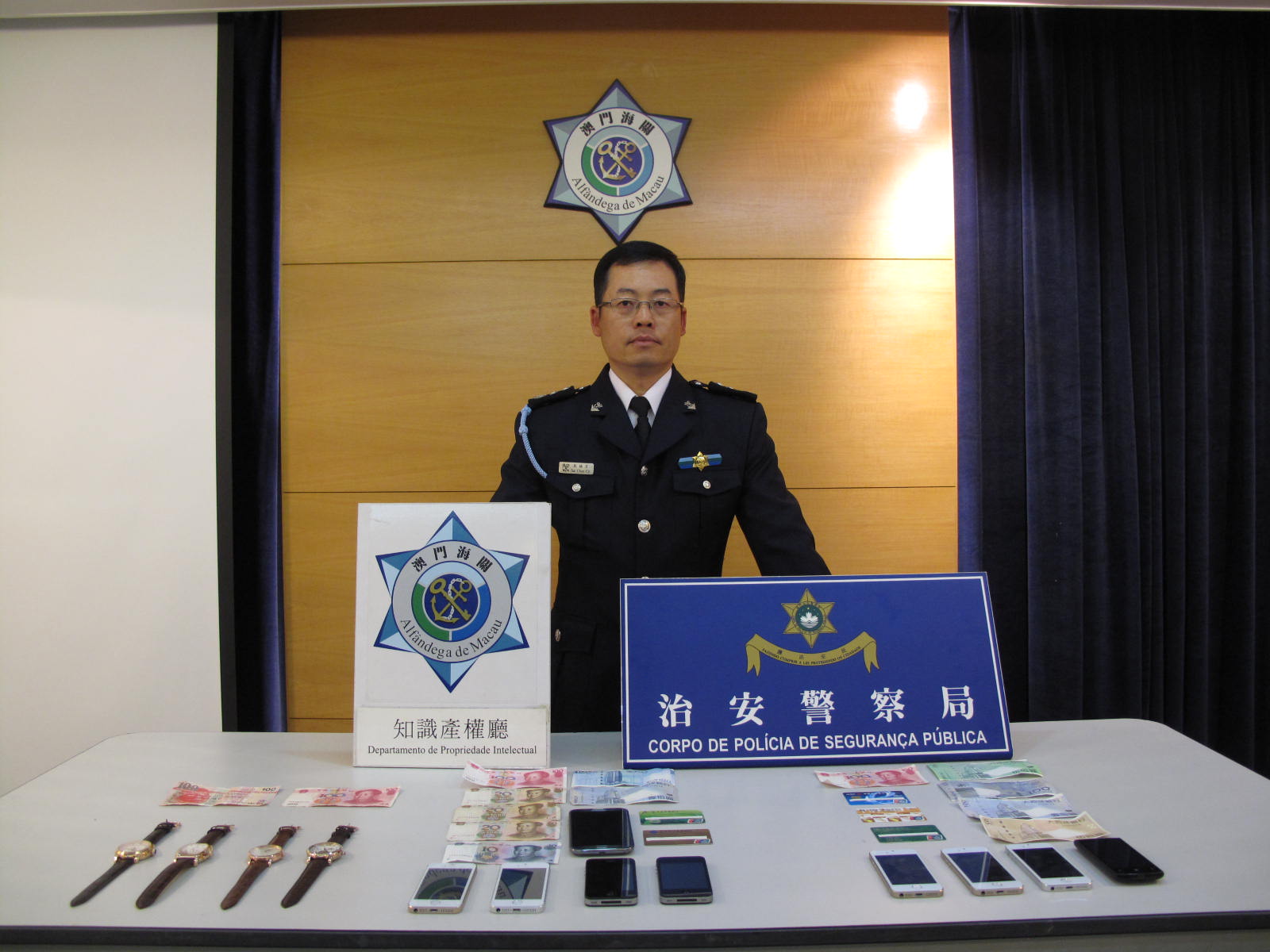 於一月六日上午,治安警察局第三警司處執勤警員,在中區街道巡邏時,發現一名形跡可疑的男子正在不斷向途人兜售手錶,遂上前截查,調查瞭解期間,在該男子身上發現四隻涉嫌侵權偽冒手錶,警員隨即將該男子帶返警區協助調查;於同日下午,治安警察局第一警司處偵查隊警員巡經大三巴旅遊區時,發現一名男子手持電話正在該處向途人兜售,警員隨即上前截查並在其身上發現四部涉嫌侵權假冒的「IPHONE」手提電話;其後海關及治安警察局根據通報機制聯合偵查,對涉案男子的所作之行為研究,翻查近期涉案記錄比對分析,推估仍可能有部分黨羽在該區作案,遂調派便衣警員和關員在該區巡查及監視。終於在同日傍晚,澳門警務廳警員在中區某街道上,再發現一名男子在街頭向途人兜售涉嫌假冒手提電話,並在其身上發現三部涉嫌侵權假冒的「IPHONE」手提電話。海關知識產權廳偵查人員在接報後,迅速依次展開調查,經初步調查發現,該三批假冒產品均為「山寨」貨品,而幾名涉案人均來自外地的旅客人士,並以旅客身份來澳門在街頭售賣假冒商標的手錶及手提電話,經調查發現,其中兩名來自同一地區的嫌犯,是與一月五日被控售假手機的男子是認識,而且作案手法類似,海關將相關痕跡記錄在案,以作日後繼續跟進同類案件分析之用。是次在嫌犯隨身物品中分別搜獲四隻涉嫌假冒國際知名品牌手錶,假冒手錶商標品牌包括有:「VACHERON CONSTANTIN」兩隻、「PATEK PHILIPPE」及「CARTIER」各一隻;七部假冒的「IPHONE」商標品牌手提電話及多部用作作案工具的手提電話。上述物品經核實,其品牌商標已在澳門特區政府經濟局作出合法註冊登記,經有關品牌權利人代表初步鑑定為假冒貨品。