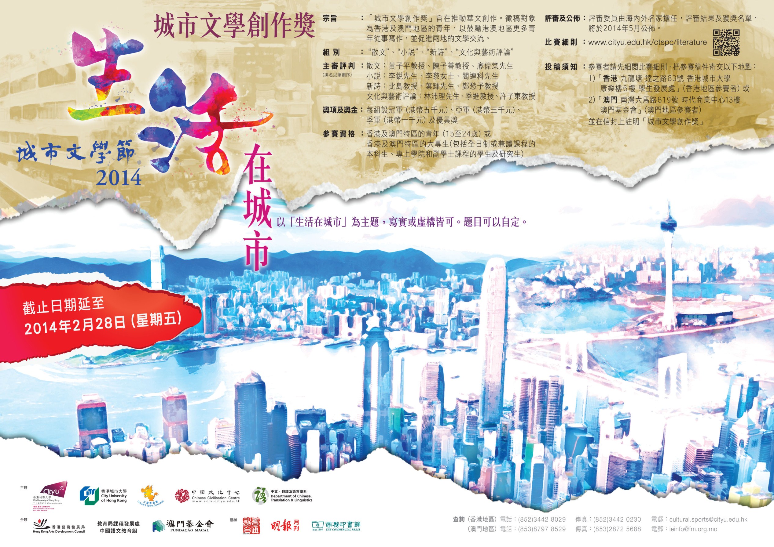 由香港城市大學主辦,香港藝術發展局、香港教育局課程發展處中國語文教育組及澳門基金會合辦的“城市文學節 2014”系列活動之“城市文學創作獎”截止投稿時間由原2014年1月31日,延期至2月28日(星期五)。歡迎年齡界乎15至24歲的港澳地區青年或就讀兩地高等教育學位課程的學生(包括全日制及兼讀制的專科、本科或研究生課程學生)投稿,獲獎名單將於本年5月公佈,所有獲獎作品並將結集出版。。