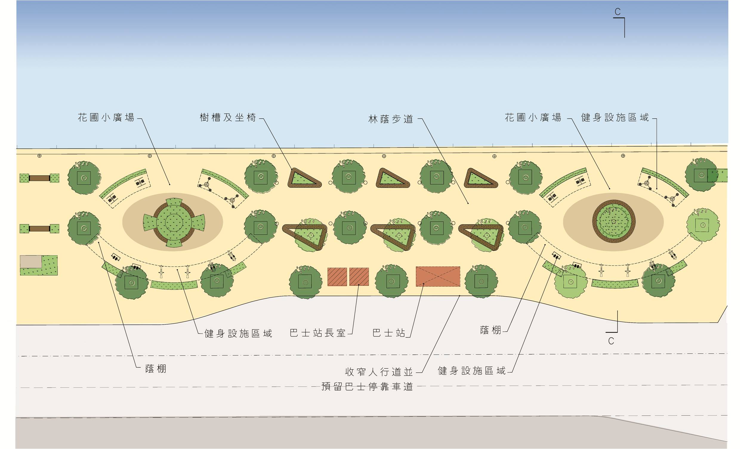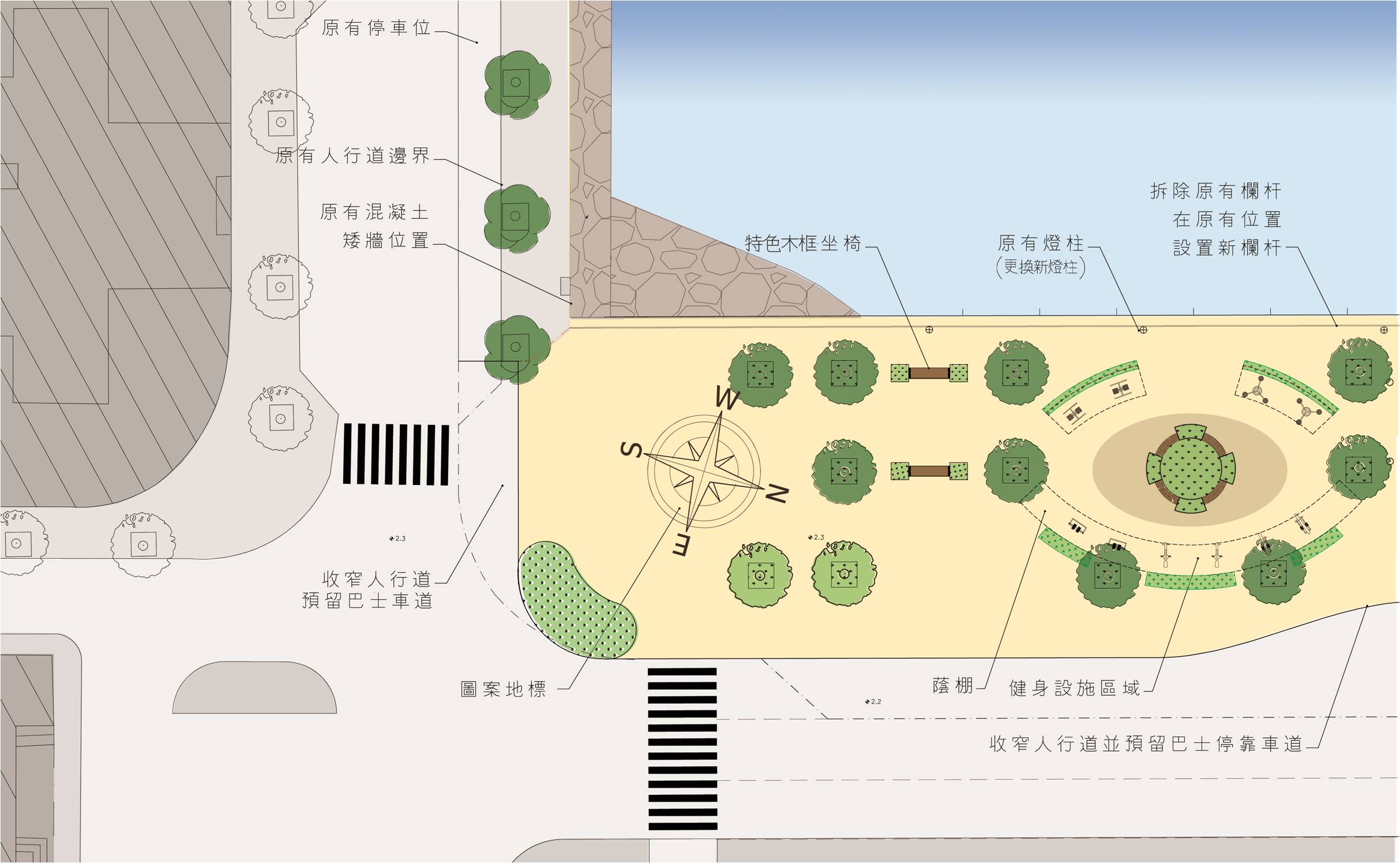 工程將分兩階段進行,除了加設蔭棚、坐椅、健身器材、兒童遊戲架等公共設施外,將重舖地磚,調整行人道邊界,更換休憩區內橙柱及沿岸欄杆等。另外,亦保留現有五十九株樹木及新種樹木二十七株,增加約四百平方米綠化面積。