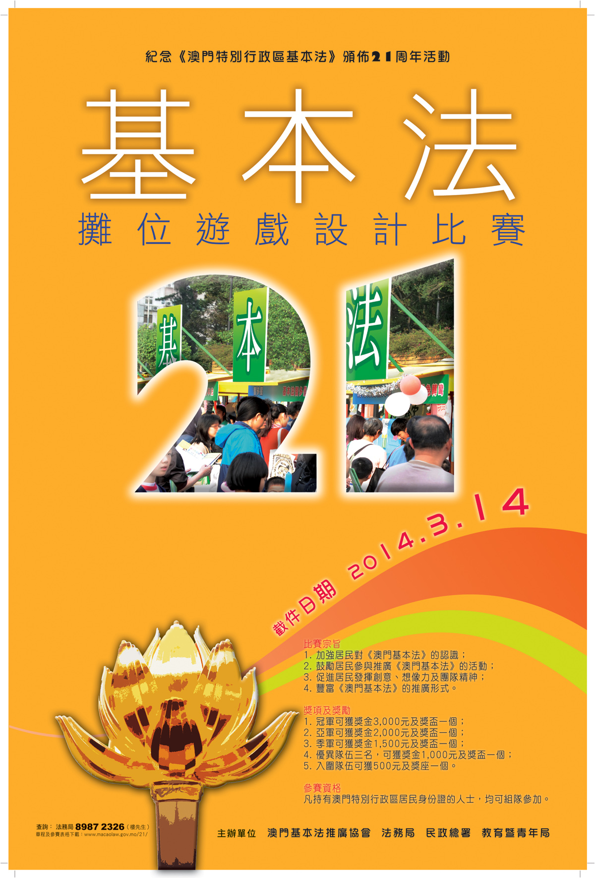 為紀念《澳門特別行政區基本法》頒佈二十一周年,澳門基本法推廣協會、法務局、民政總署及教育暨青年局將共同合辦一系列的紀念活動,而其中的攤位遊戲設計比賽現正接受報名,歡迎市民組隊參加。