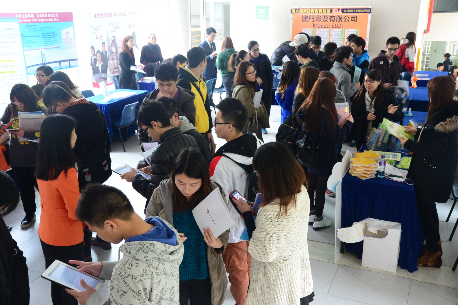 澳門大學今日起一連五日舉行二○一四年度澳大就業及實習資訊展,吸引超過六十五家企業為應屆畢業生提供逾二千三百個職位空缺,並為大二及大三學生提供實習機會。期間,澳大還將舉行三十場招聘講座,向學生介紹職業生涯規劃、就業方向和發展前景等。