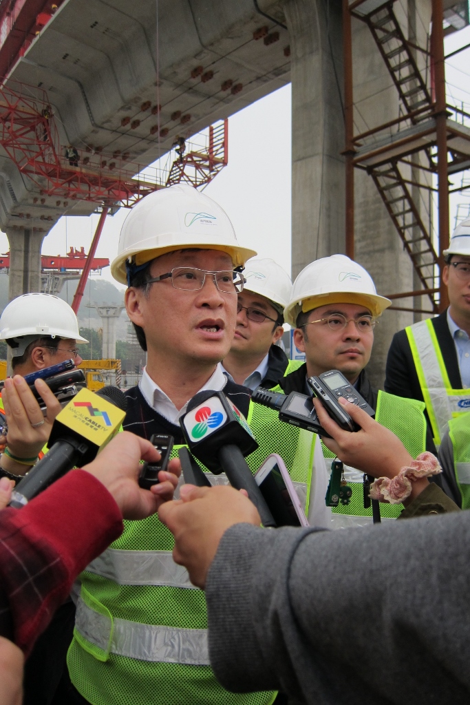 輕軌氹仔線首跨高架橋面預製件吊裝工作於氹仔飛機場圓形地展開,首跨度共12件預製件已經用架橋機成功吊起,施工單位在完成固定及於高架橋張拉預應力鋼索後,首跨度輕軌高架橋的吊裝工作便告完成,預計首跨度吊裝需時約二至三星期。