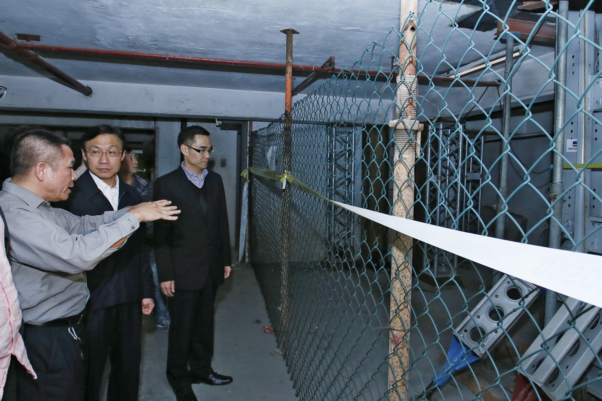 譚俊榮逐一與在現場的小業主握手慰問,並在小業主代表的帶領下進入善豐花園察看“爆柱”的加固情況。