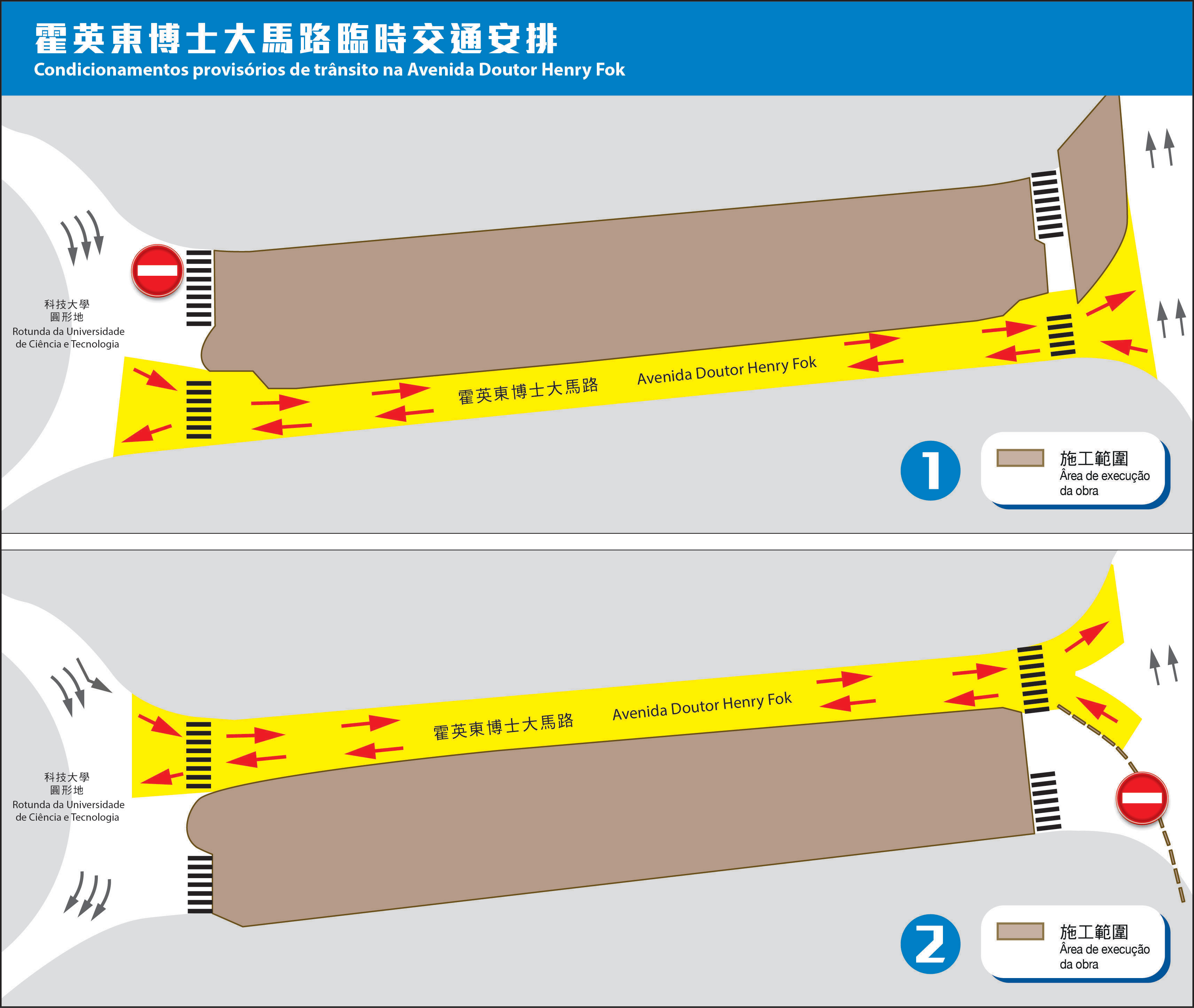完成首階段後,第二階段施工會隨即開展,以配合建設接駁輕軌車廠的一段高架橋,屆時,施工單位將恢復使用靠近科技大學一側的霍英東博士大馬路作雙向單線行車,並封閉靠近永利地盤一側的霍英東博士大馬路,直至工程完成。交通事務局將密切關注施工情況,適時調整附近巴士站點及泊車位的位置。