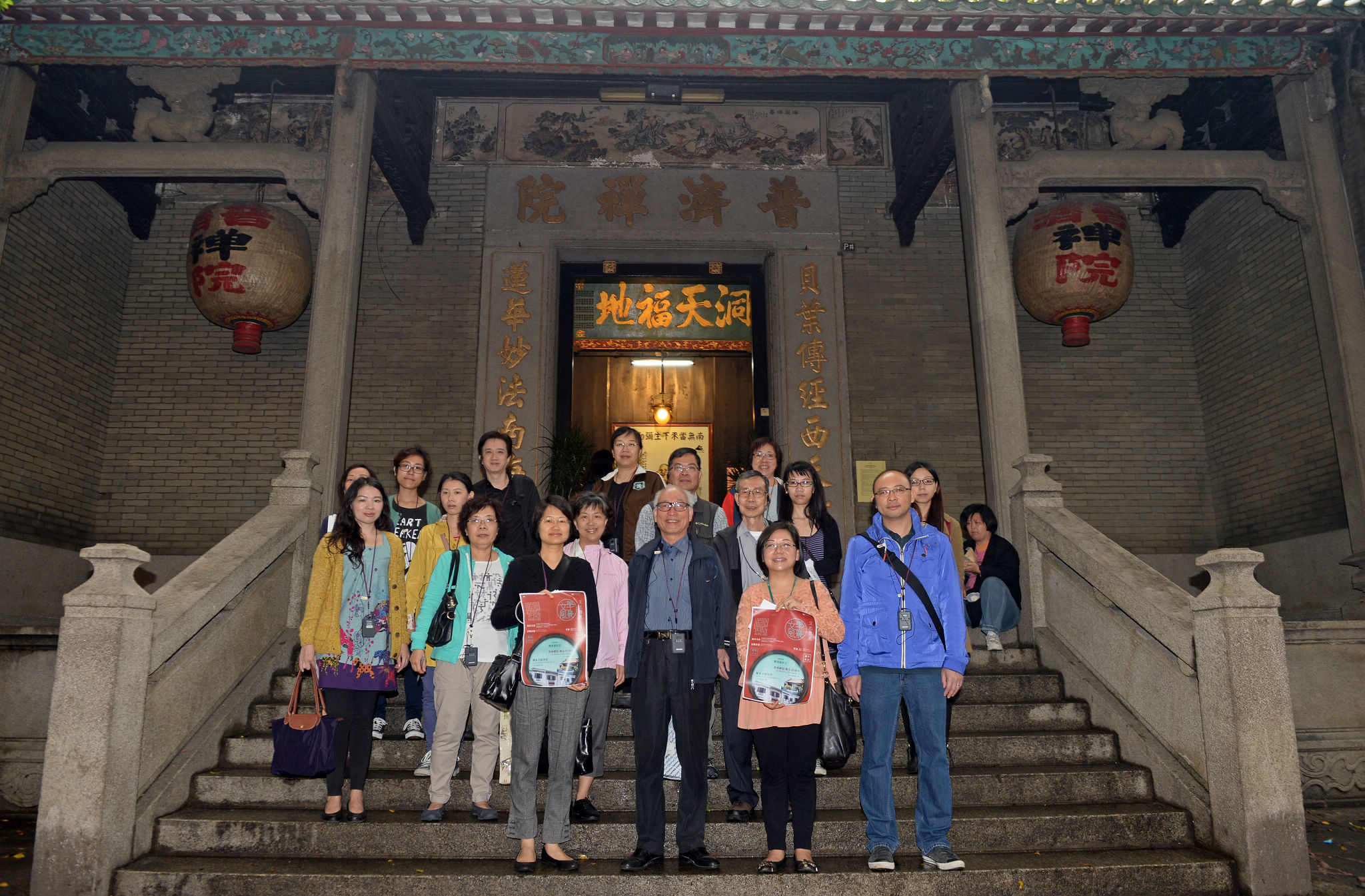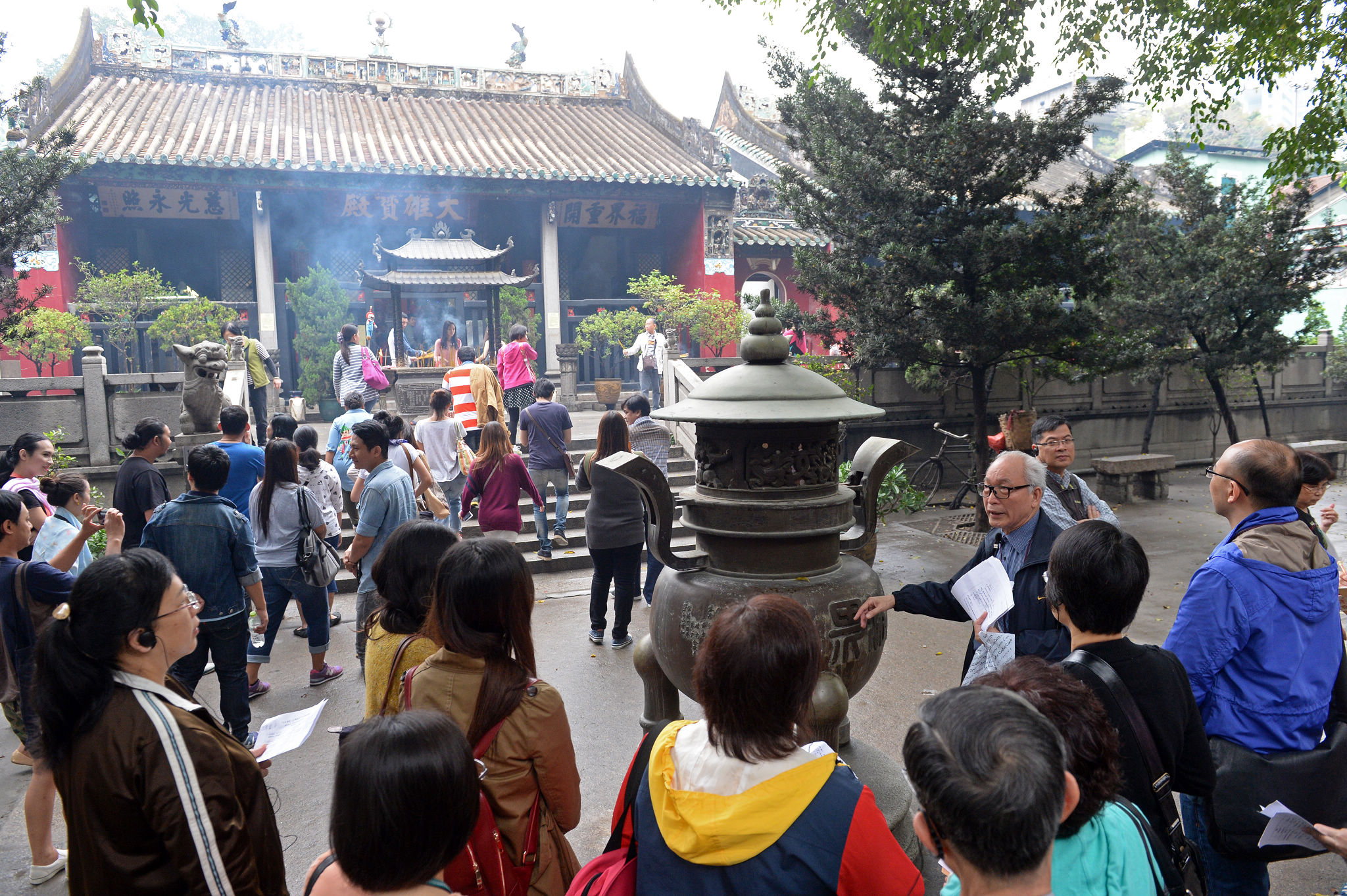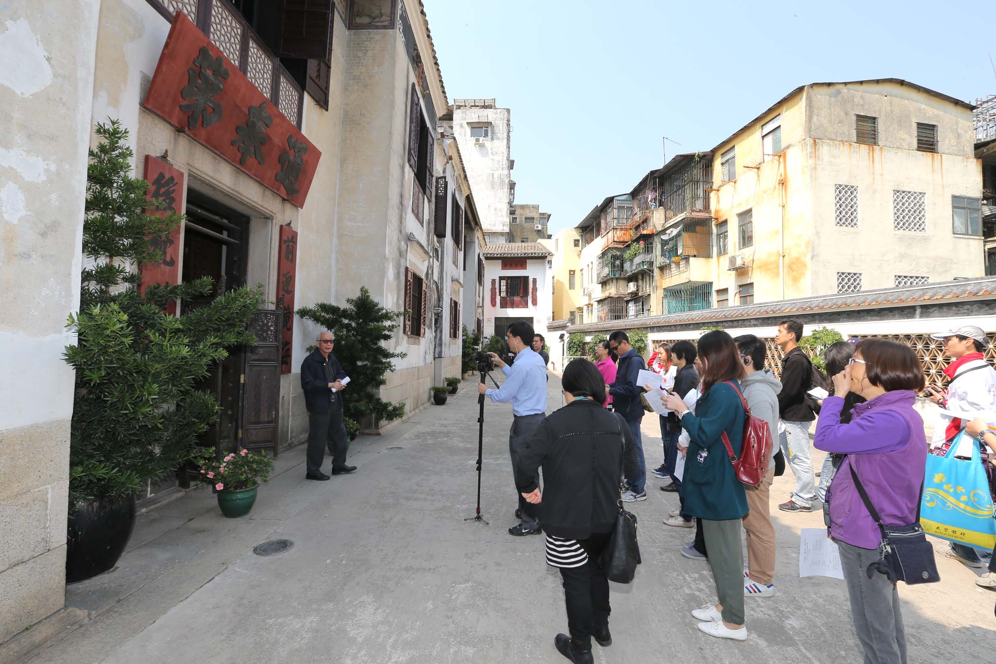 去年文化局與澳門文物大使協會首次在盧廉若花園及媽閣廟舉辦“文化遺產‧文學風景”導賞活動,反應非常熱烈,獲得參與者的肯定。今年主辦方續辦有關活動,分別在世界文化遺產之一的鄭家大屋以及澳門三大古廟之一的普濟襌院(觀音堂)舉行,並再度邀請對澳門楹聯及詩歌素有研究的鄧景濱教授作為導賞嘉賓。鄧景濱為澳門大學中文系榮休教授、博士生導師,出版著作二十餘種。鄧教授深入淺出地向參與者講述了鄭家大屋多項珍貴的牌匾、對聯的意思、格律及其背後蘊含的故事,並介紹了鄭觀應當年以澳門為題所創作的詩歌《題澳門新居》及《澳門感事》。而在普濟襌院內,鄧教授逐一講解院內的各副楹聯及書畫,遇到難以辨認的字體時,更詳細地從古今文字的演變及其意思深入解釋,以生動活潑的方式教授參加者如何從文字的形、音、義來記憶漢字;導賞活動的參加者細心認真聆聽講解,不少參加者對楹聯文化甚感興趣,即席發問,互動交流,並對於有關文物的傳承與保育表示關注。