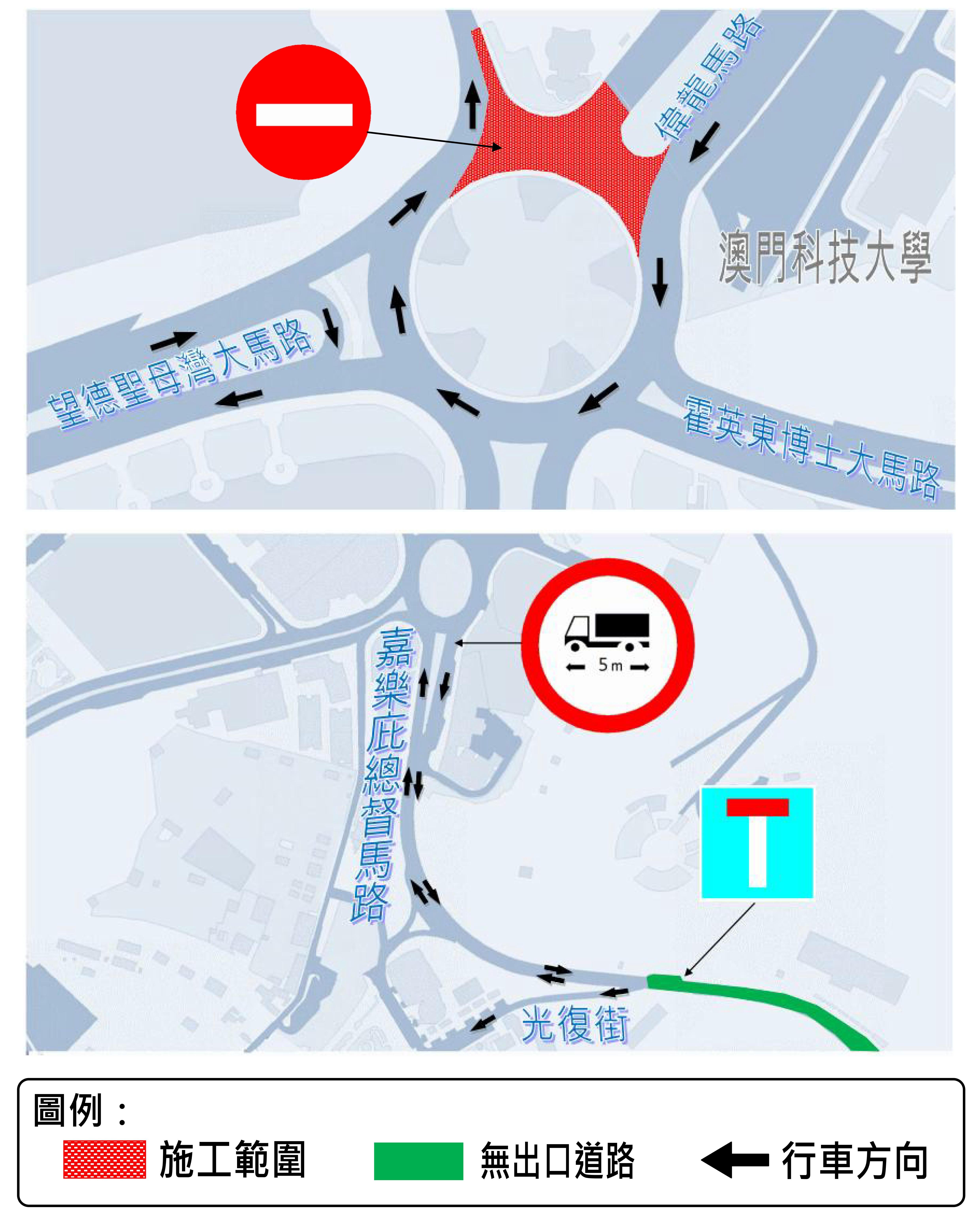 配合建設發展辦公室安裝行人天橋工作,路氹連貫公路圓形地近嘉樂庇總督馬路的路段於本月6日至8日(周日至周二)每日晚上11時至翌日凌屒6時封閉交通,介乎光復街至路氹連貫公路圓形地之間的一段嘉樂庇總督馬路亦會改為無出口道路,並禁止車長超過5米之車輛駛入嘉樂庇總督馬路。