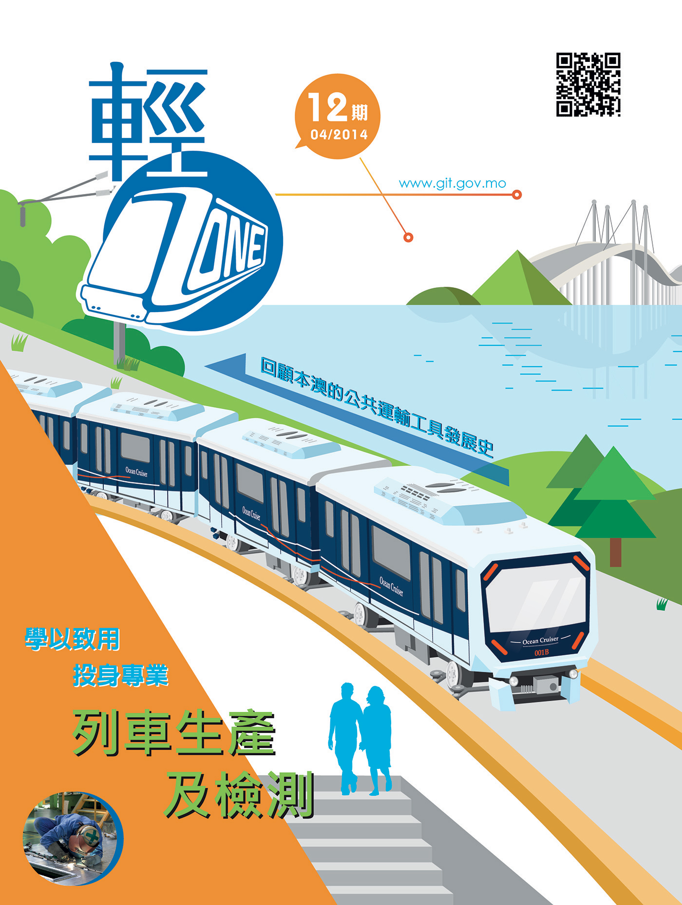 澳門輕軌列車現已處於批量生產階段,第十二期輕軌季刊《輕Zone》,將為大家報導列車現時的生產情況,並請來參與輕軌系統建設工作的青年工程師,與讀者們分享本地人才參與輕軌建設的經驗。市民即日起可於指定站點免費索取新一期季刊,或登入運輸基建辦公室網站瀏覽及下載。